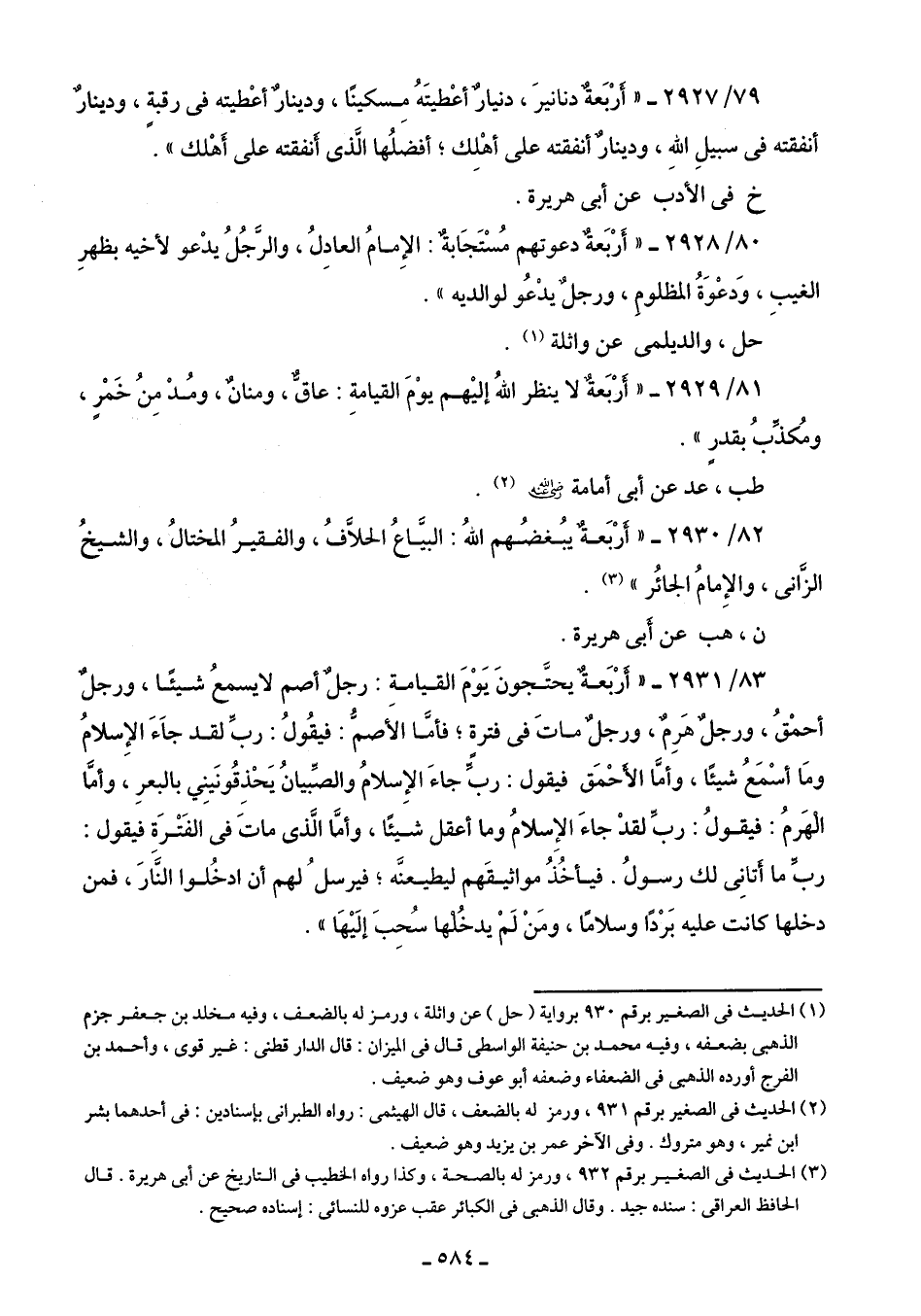 (¬3) الحديث في الصغير برقم 932، ورمز له بالصحة، وكذا رواه الخطيب في التاريخ عن أبي هريرة. قال الحافظ العراقي: سنده جيد. وقال الذهبي في الكبائر عقب عزوه للنسائى: إسناده صحيح.