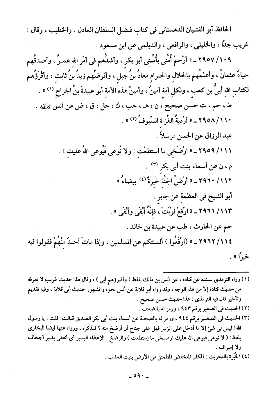 109/ 2957 - "أرحم أُمتى بأُمَّتِى أبو بكرٍ، وأشدهم في أمرِ اللهِ عمرُ، وأصدقُهم حياءً عثمانُ، وأعلمُهم بالحلالِ والحرام معاد بن جبلٍ، وأفرضُهم زيدُ بن ثابتِ، وأقْرَؤُهم لكتابِ اللهِ أبي بن كعبٍ، ولكلِ أمةٍ أمين، وأمين هذه الأمةِ أبو عبيدةَ بن الجراحِ (¬1) ".