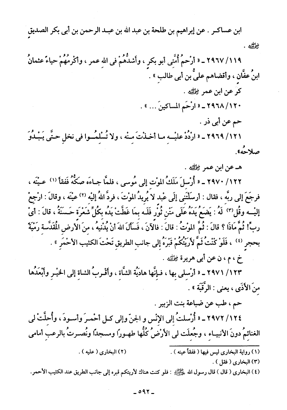 122/ 2970 - "أرسِلَ مَلَكُ الموْتِ إلى مُوسى، فلمَا جاءَه صَكُّهُ فَفقأ (¬1) عينَه، فرجَعَ إلى ربِّهِ، فقال: أرسَلتَنِى إلَى عبدٍ لا يُرِيدُ الموْتَ، فردَّ اللهُ إليهِ (¬2) عينَه، وقال: ارجع إليه وقُل (¬3) لَهُ: يَضَعُ يَدَهُ عَلَى مَتْنِ ثُوْرٍ فَلَه بِمَا غَطَّتْ يَدُه بِكُلِّ شَعرَة حَسَنَةُ، قال: أي ربِّ! ثُمَّ مَاذَا؟ قال: ثُمَّ الموْتُ: قال: فالآنَ، فَسَأل الله أنْ يدنيهُ، مِنَ الأرضِ المُقدَّسةِ رَميَةً بحجرٍ (¬4)، فَلَوْ كْنْتُ ثَمَّ لأرَيتُكُم قَبْرَهُ إِلى جانبِ الطريقِ تَحتَ الكثيب الأحمرِ".