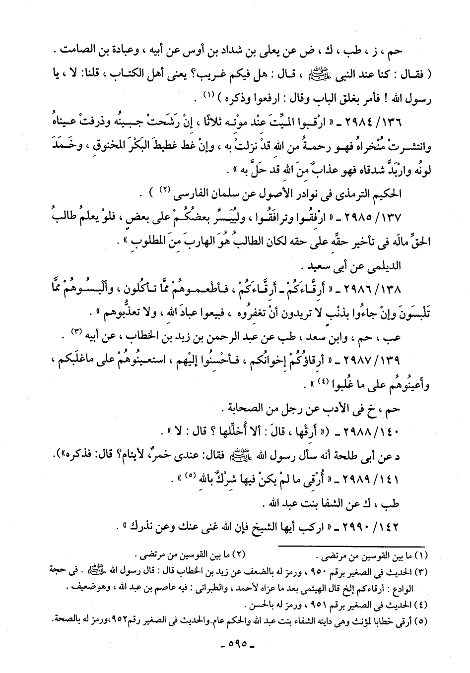 138/ 2986 - "أَرِقَّاءَكم -أرِقَّاءَكم، فأطْعموهُم ممَّا تأكُلون، وألبسُوهُم ممَّا تَلبسَونَ وإنْ جاءُوا بذنْبٍ لا تريدون أنْ تغفِرُوه، فبيعوا عبادَ اللهِ، ولا تعذبوهم".