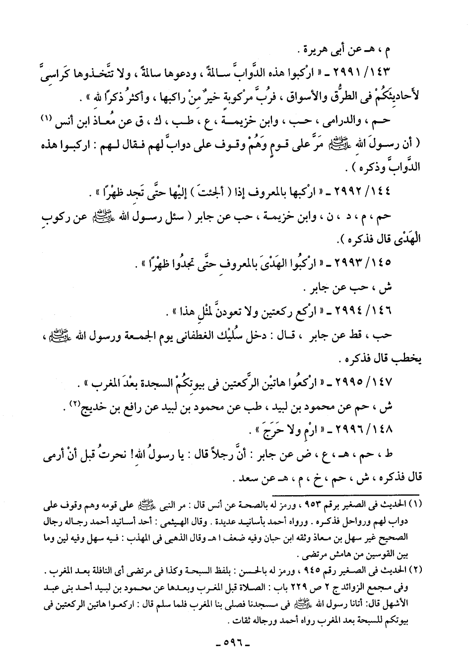 143/ 2991 - "اركبوا هذه الدَّوابَّ سالمةً، ودعوها سالمةً، ولا تتَّخذوها كَراسِيَّ لأحاديثَكُم في الطُّرق والأسواق، فرُبَّ مركوبةٍ خيرٌ مِنْ راكبها، وأكثرُ ذكرًا للهِ".