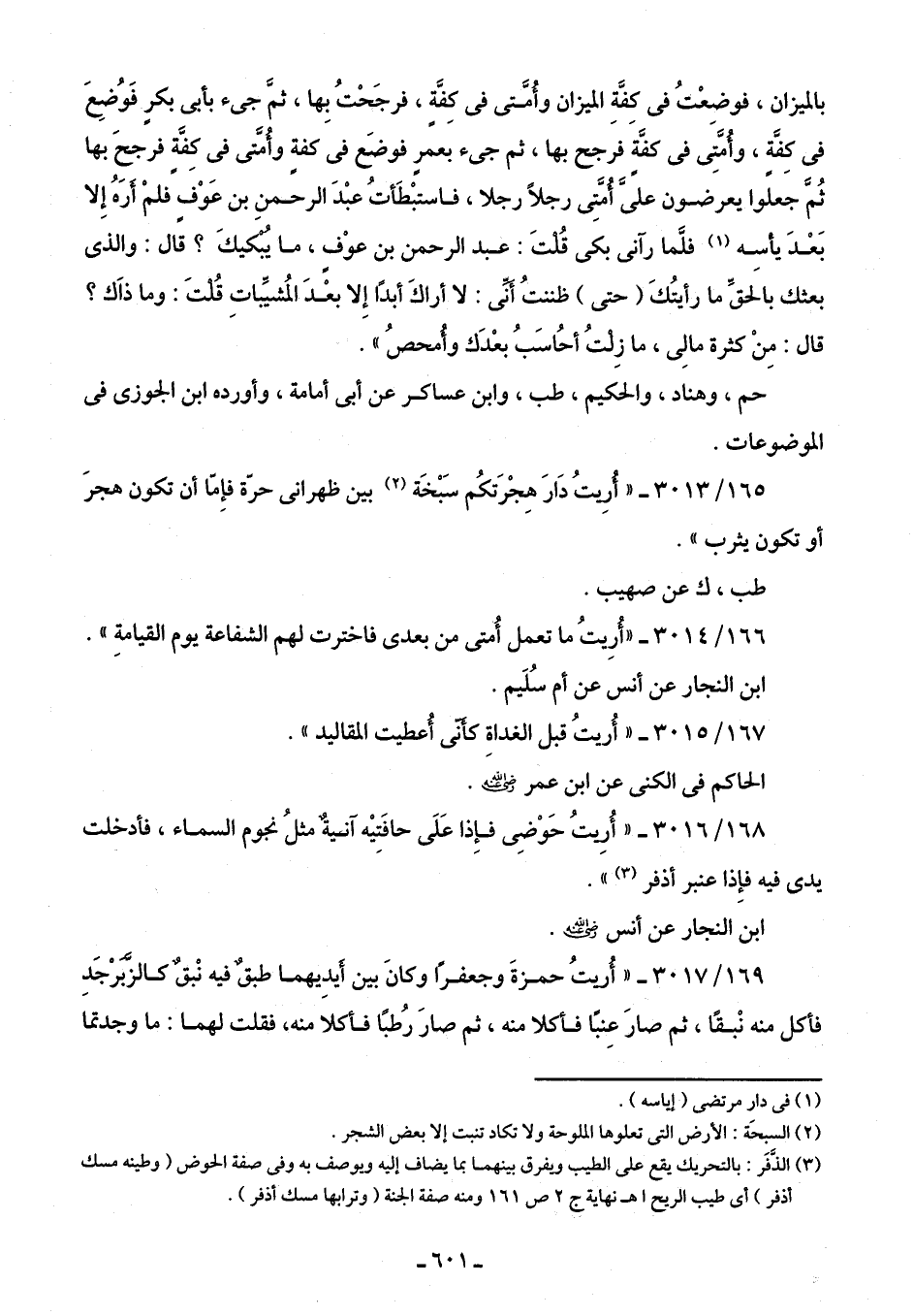 168/ 3016 - " أُرِيتُ حَوْضِى فإِذا عَلَى حافَتِيه آنية مثلُ نجوم السماء، فأدخلت يدي فيه فإِذا عنبر أذفر (¬3) ".