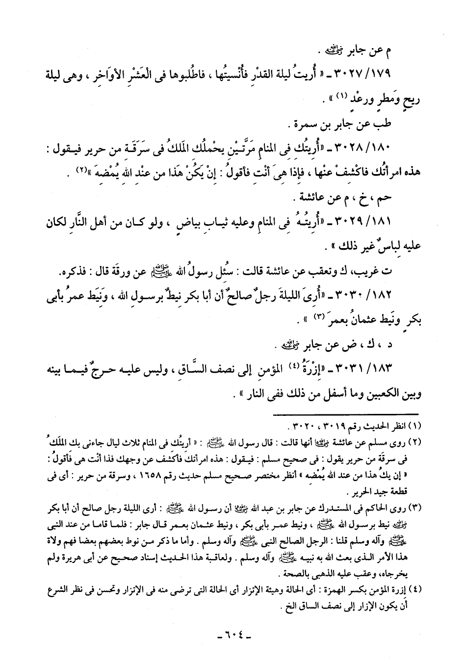 180/ 3028 - "أُرِيتُكِ في المنامِ مرَّتينِ يحْمِلُك الملكُ في سَرَقَةِ من حريرٍ فيقولُ: هذه امرأتُك فأكشفُ عنها, فإذا هي أنتِ فأقولُ: إنْ يكنْ هذا من عندِ اللهِ يُمْضِهِ" (¬2).