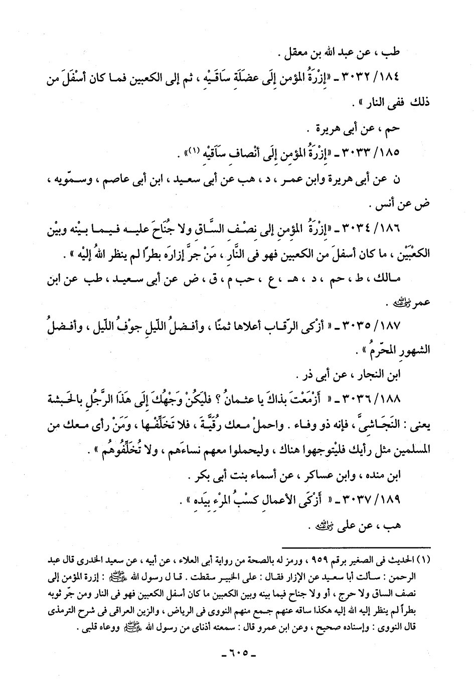185/ 3033 - "إِزْرَةُ المؤمِن إِلَى أنْصافِ سَاقيهِ (¬1) ".