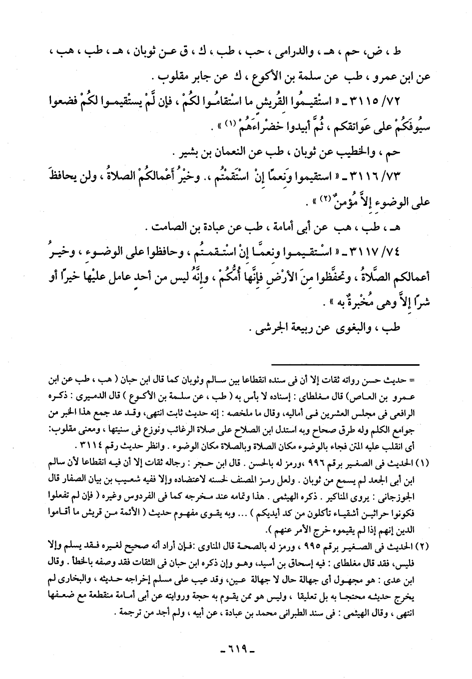 73/ 3116 - "استقيموا وَنِعمًا إِنْ اسْتَقمْتُم، وخيرُ أَعْمالكُمْ الصلاةُ، ولن يحافظَ على الوضوءِ إِلَّا مُؤمنٌ (¬2)! .