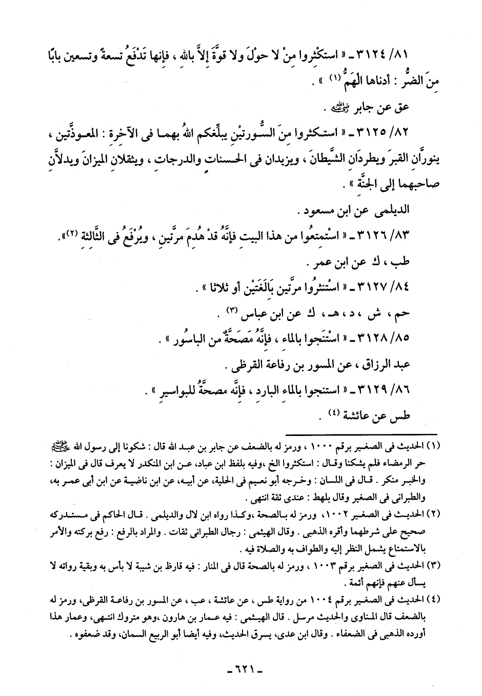 82/ 3125 - "استكثروا مِنَ السُّورتينِ يبلِّغكم اللهُ بهما في الآخِرةِ: المعوذَّتين، ينورَّانِ القبرَ ويطردَانِ الشَّيطانَ، ويزيدان في الحسنات والدرجات، ويثقلانِ الميزانَ ويدلَّانِ صاحبهما إلى الجنَّةِ".