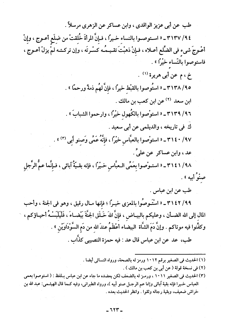 94/ 3137 - "استوصوا بالنساءِ خيرًا، فإِن المرأةَ خُلِقتْ من ضِلَعٍ أعوج، وإِن أعْوجَ شيءٍ في الضلع أعلاه، فإِنْ ذهبْتَ تقيمُه كسْرتَه، وإن تركته لمْ يزلْ أعوج، فاستوصوا بالنساء خيرًا".