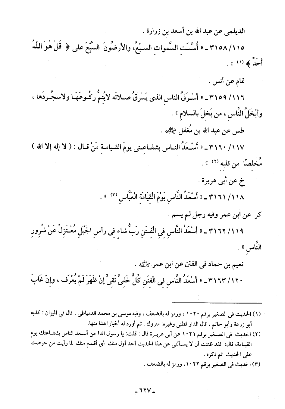 116/ 3159 - "أسْرَقُ الناسِ الذي يَسْرقُ صلاتَه لا يُتِمُّ ركُوعَهَا ولا سجُودَها، وأبْخَلُ النَّاسِ، من بَخِلَ بالسلام".