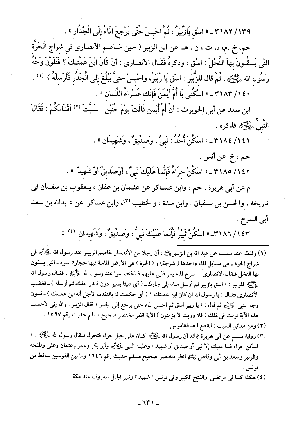 141/ 3184 - "اسْكُنْ أُحُدُ: نَبِيٌّ، وَصِدِّيقٌ، وَشَهِيدَان".