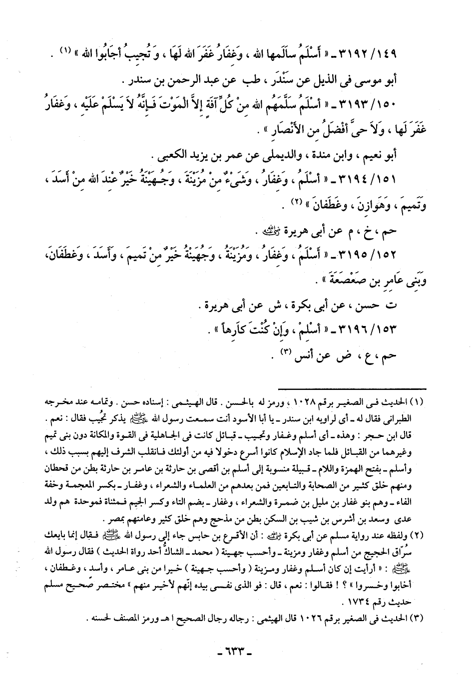 150/ 3193 - "أسْلَمُ سَلَّمَهُم الله مِنْ كُلِّ آفَةٍ إِلَّا الْمَوْتَ فَإِنَّهُ لَا يَسْلَمْ عَلَيهِ، وَغفَارُ غَفَرَ لَها، وَلَا حيَّ أفْضَلُ مِن الأَنْصَارِ".