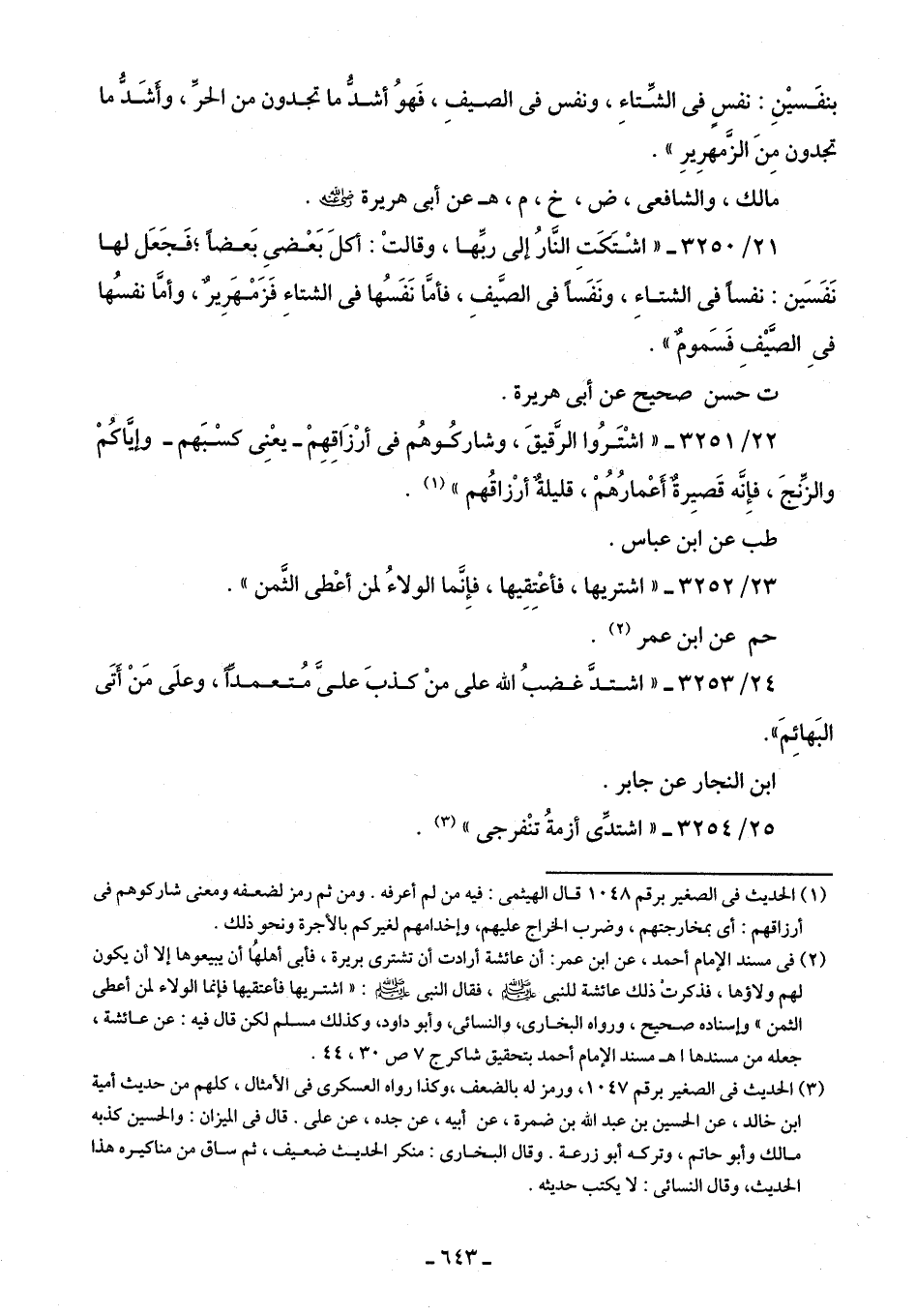 22/ 3251 - "اشْتَرُوا الرَّقيقَ، وشاركُوهُم في أرْزَاقِهِمْ -يعْنِي كسْبَهم- وإيَّاكمْ والزِّنجَ، فإِنَّه قَصيِرةٌ أَعْمارُهُمْ، قليلةٌ أرْزاقُهم" (¬1).