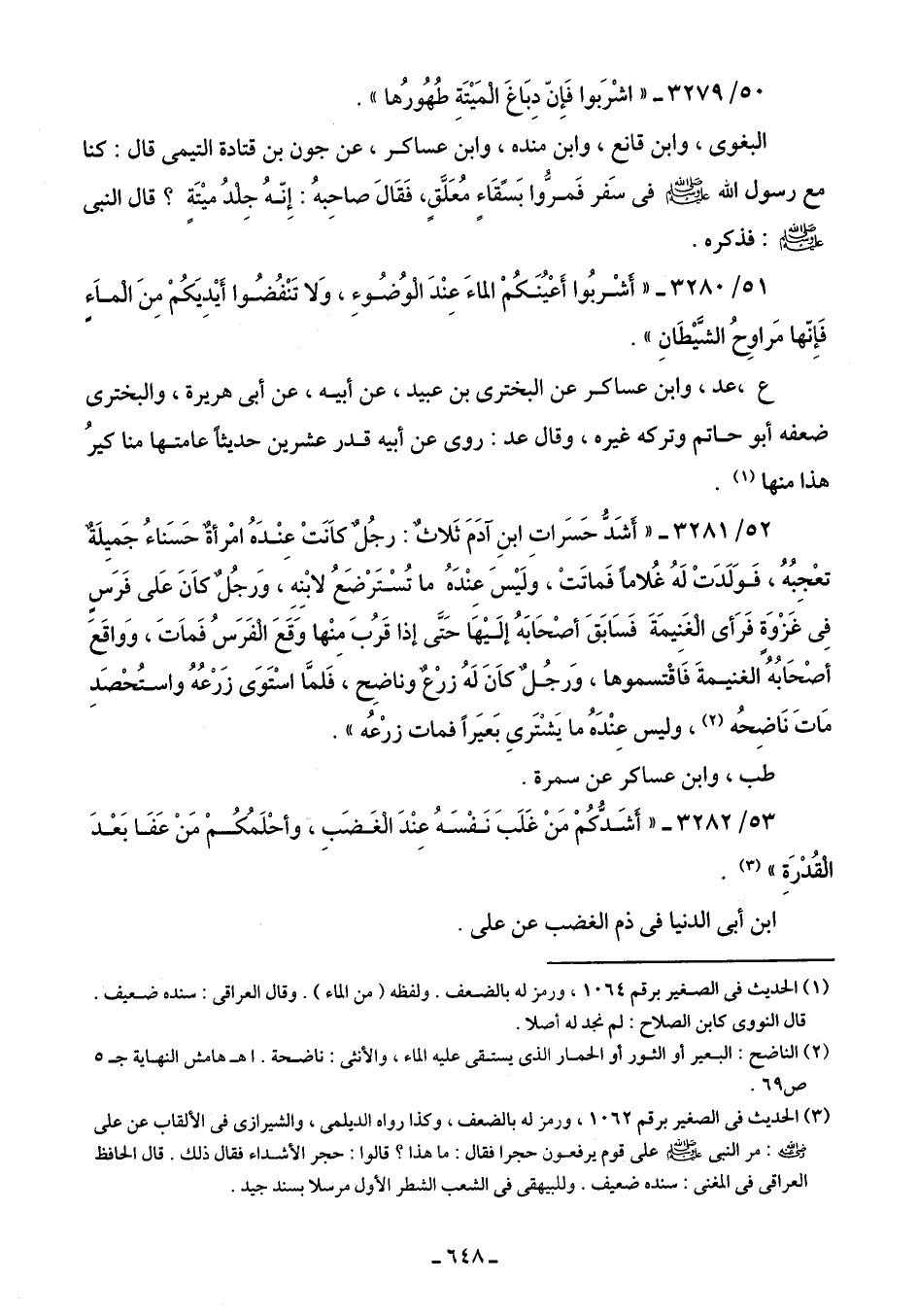53/ 3282 - "أَشَدُّكُمْ مَنْ غَلَبَ نَفْسَهُ عنْدَ الْغَضَب، وأحْلَمُكُمْ مَنْ عَفَا بَعْدَ الْقُدْرَةِ" (¬3).