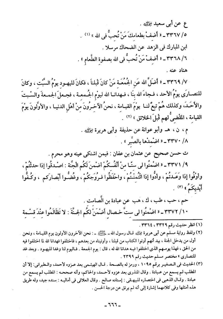 7/ 3369 - "أَضَلَّ الله عَنِ الجُمُعَةِ مَنْ كانَ قْبلنا، فكانَ لليهودِ يوْمُ السَّبْتِ، وكانَ للنصارَى يوْمُ الأحد، فجاءَ الله بِنَا، فهدانا الله ليوْمِ الجُمعِة، فجعلَ الجمعةَ والسْبتَ والأَحَدَ، وكذلك هُمْ تبعٌ لنا يوْمَ القيامة، نحنُ الآخِرُونَ مِنْ أهْلِ الدنيا، والأوَّلونَ يوْمَ القيامة، المقْضِيُّ لهم قْبلَ الخلائق" (¬2).