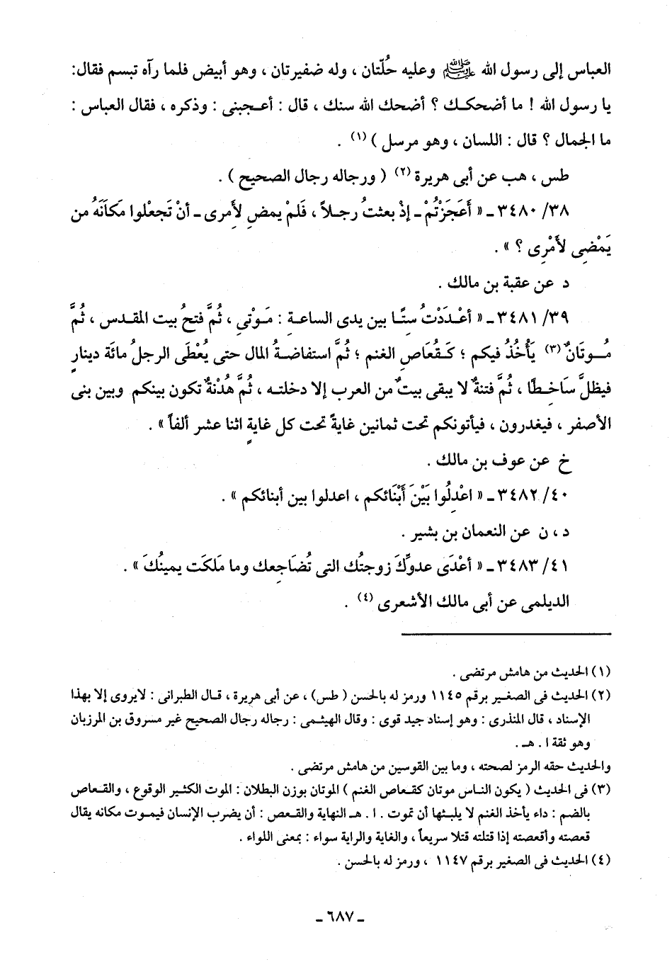 (¬2) الحديث في الصغير برقم 1145 ورمز له بالحسن (طس)، عن أبي هريرة، قال الطبراني: لا يروى إلا بهذا الإسناد، قال المنذرى: وهو إسناد جيد قوى: وقال الهيثمي: رجاله رجال الصحيح غير مسروق بن المرزبان وهو ثقة ا. هـ.