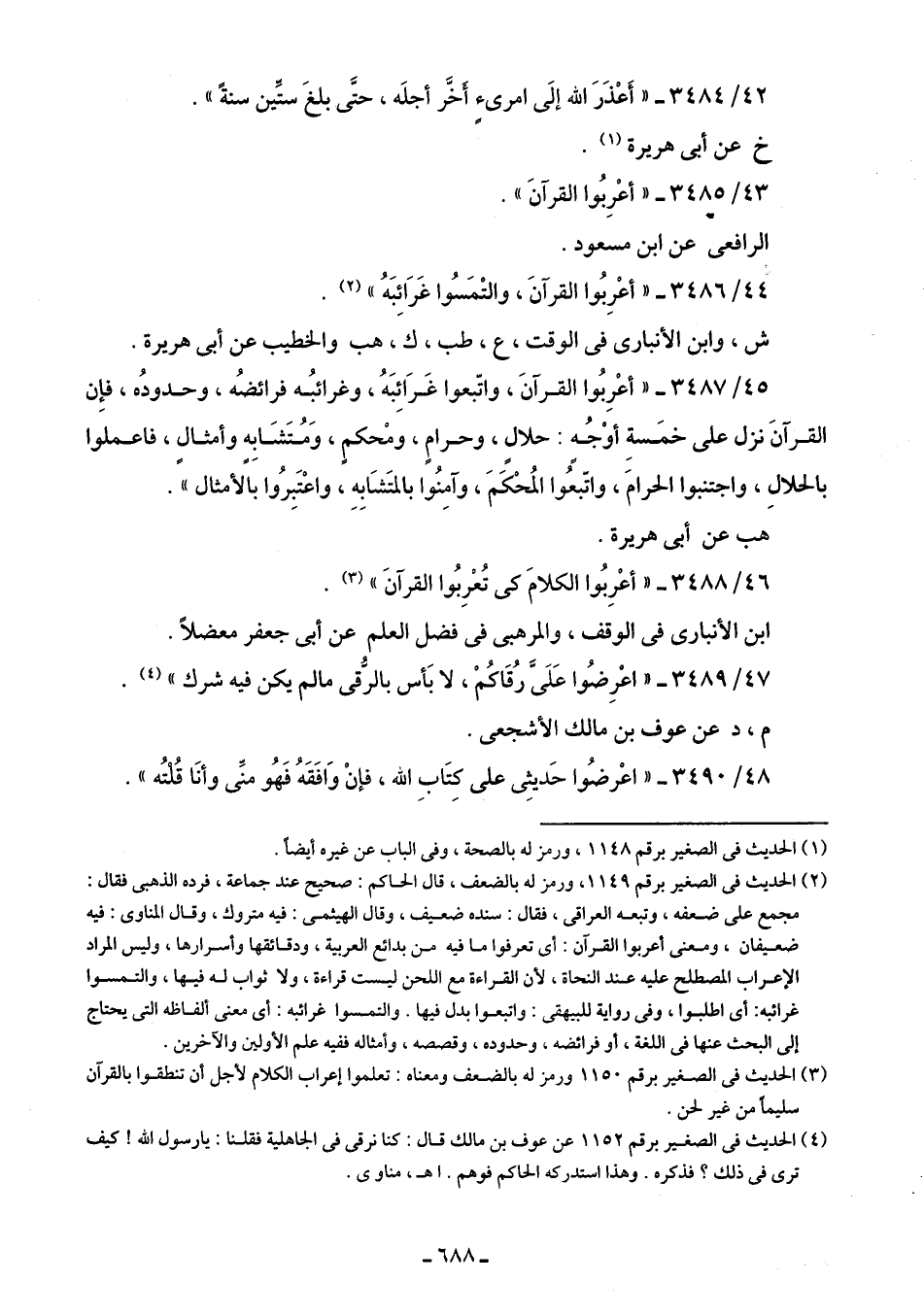 45/ 3487 - "أعْرِبُوا القرآنَ، واتّبعوا غَرَائِبَهُ، وغرائبُه فرائضُه، وحدودُه، فإِن القرآنَ نزل على خمَسةِ أوْجُهٍ: حلالٍ، وحرامٍ، ومُحكمٍ، وَمُتَشَابِهٍ وأمثالٍ، فاعملوا بالحلالِ، واجتنبوا الحرامَ، واتّبعُوا المُحْكَمَ، وآمِنُوا بالمتَشَابِهِ، واعْتَبِرُوا بالأمثال".