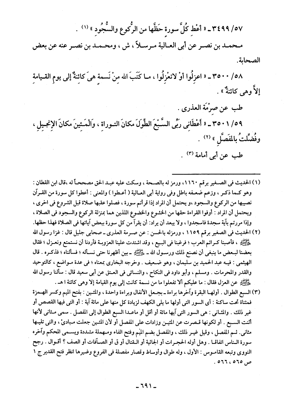 59/ 3501 - "أعْطَانِي ربِّي السَّبع الطِّوَلَ مكانَ التوراة، وَالمئينَ مكانَ الإِنجيلِ، وفُضِّلتُ بالمفَصَّلِ" (¬2).