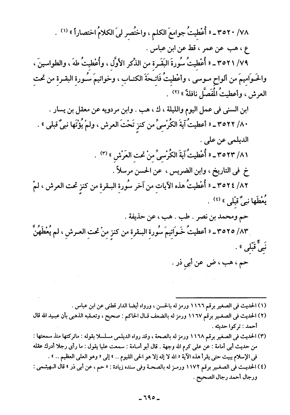 82/ 3524 - "أُعْطيتُ هذه الآياتِ من آخر سُورةِ البقرةِ من كنزٍ تحت العرش، لمْ يُعْطَها نبيٌّ قبلي" (¬4).