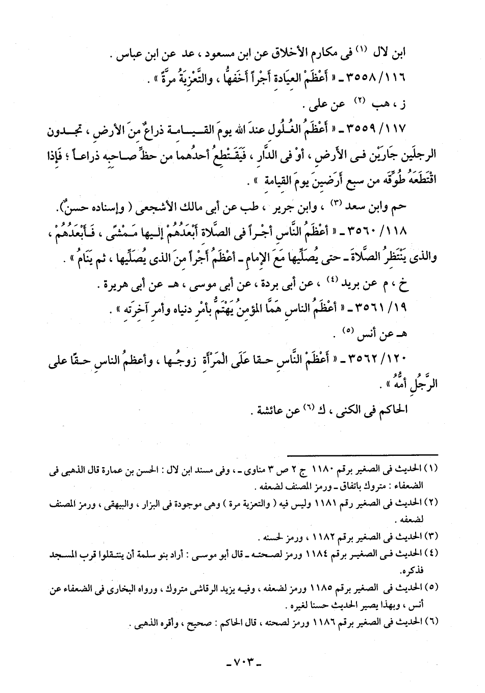 116/ 3558 - "أَعْظَم العِيَادةِ أَجْرًا أَخَفُّها، والتَّعْزِيَةُ مرَّةً".