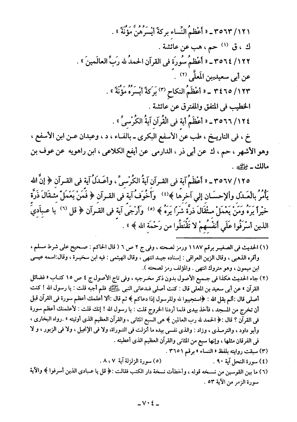 125/ 3567 - "أعْظَمُ آية في القرآنِ آيةُ الكُرْسِيِّ، وأعَدَلُ آيةٍ في القرآنِ {إِنَّ اللَّهَ يَأْمُرُ بِالْعَدْلِ وَالْإِحْسَانِ إلي آخِرِها} (¬4) وَأَخُوَفُ آية في القرآنِ {فَمَنْ يَعْمَلْ مِثْقَال ذَرَّةٍ خَيرًا يَرَهُ (7) وَمَنْ يَعْمَلْ مِثْقَال ذَرَّةٍ شَرًّا يَرَهُ (8)} (¬5) وَأرْجَى آيةٍ في القرآن {قُلْ (¬6) يَاعِبَادِيَ الَّذِينَ أَسْرَفُوا عَلَى أَنْفُسِهِمْ لَا تَقْنَطُوا مِنْ رَحْمَةِ اللَّهِ} ".