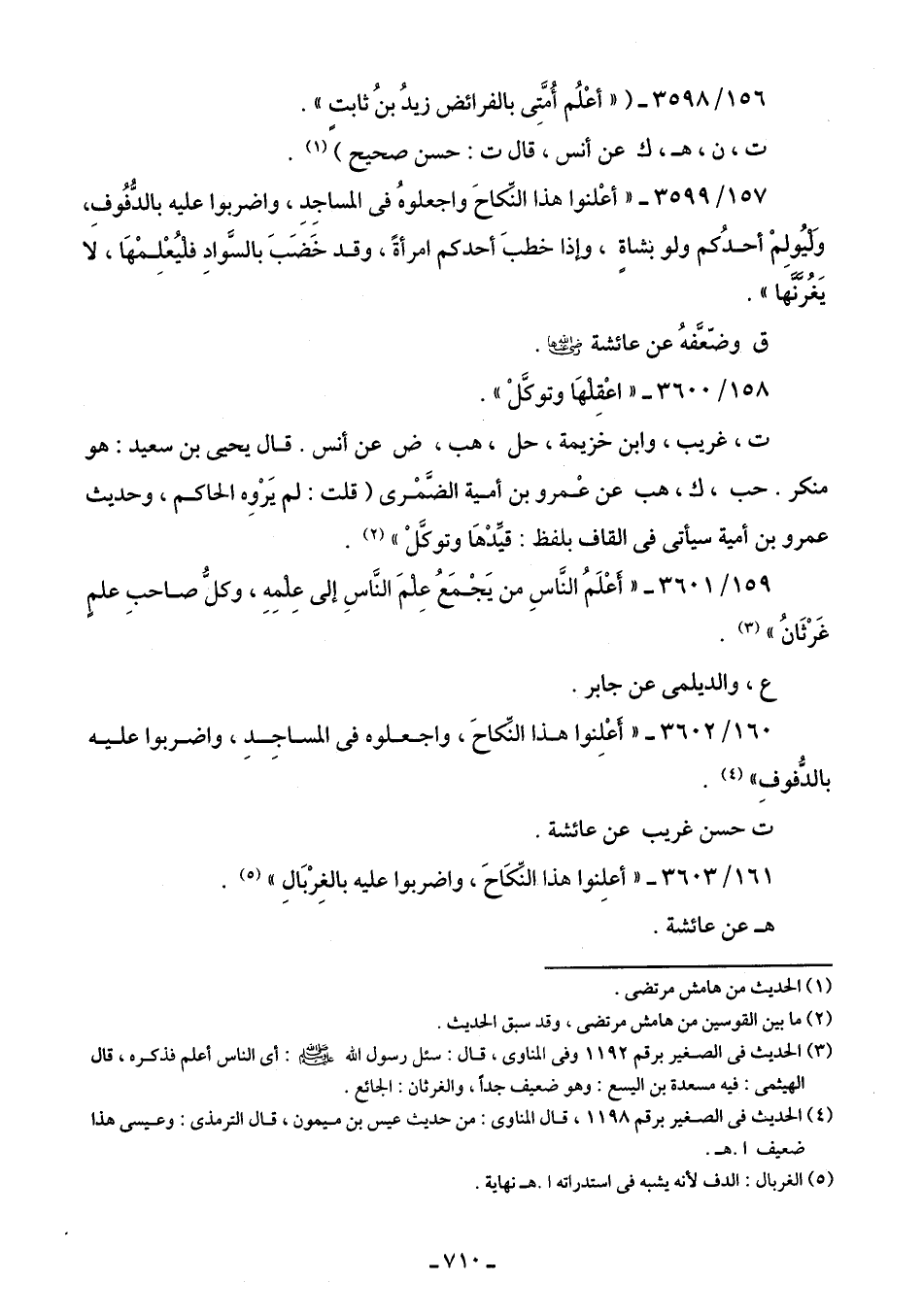 157/ 3599 - "أعْلنوا هذا النّكاحَ واجعلوهُ في المساجِدِ، واضربوا عليه بالدُّفُوفِ، وَلْيُولِمْ أحدُكم ولو بشاةٍ، وإذا خطبَ أحدكم امرأةً، وقد خَضَبَ بالسَّواد فليُعْلمْهَا، لا يَغُرَّنَّها".