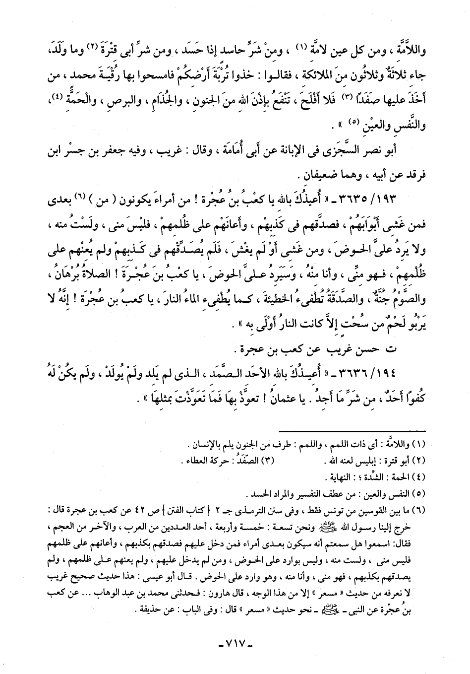 194/ 3636 - "أُعِيذُكَ باللهِ الأحَد الصَّمَدِ، الذي لم يَلِد ولَمْ يُولَدْ، ولَم يكُنْ لَهُ كُفوًا أَحَدٌ، مِن شَرِّ مَا أَجِدُ. يا عثمانُ! تعوَّذْ بِهَا فَمَا تَعَوَّذْتَ بمثلِهَا".