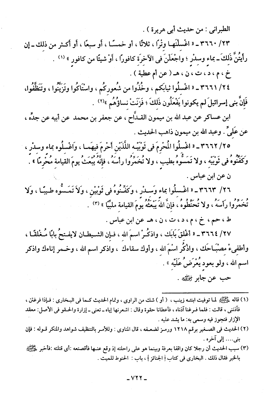 25/ 3662 - لا اغْسلُوا المُحْرِمَ في ثَوْبَيه اللَّذَينِ احْرمَ فِيهَما، وَاغْسِلُوه بماء وسِدْر، وَكَفِّنوهُ في ثَوْبَيهِ، ولا تَمسُّوَه بطيب، ولا تُخَمِّرُوا رأسَهُ، فإِنَهُ يُبْعَثُ يومَ القيامةِ مُحْرِمًا".