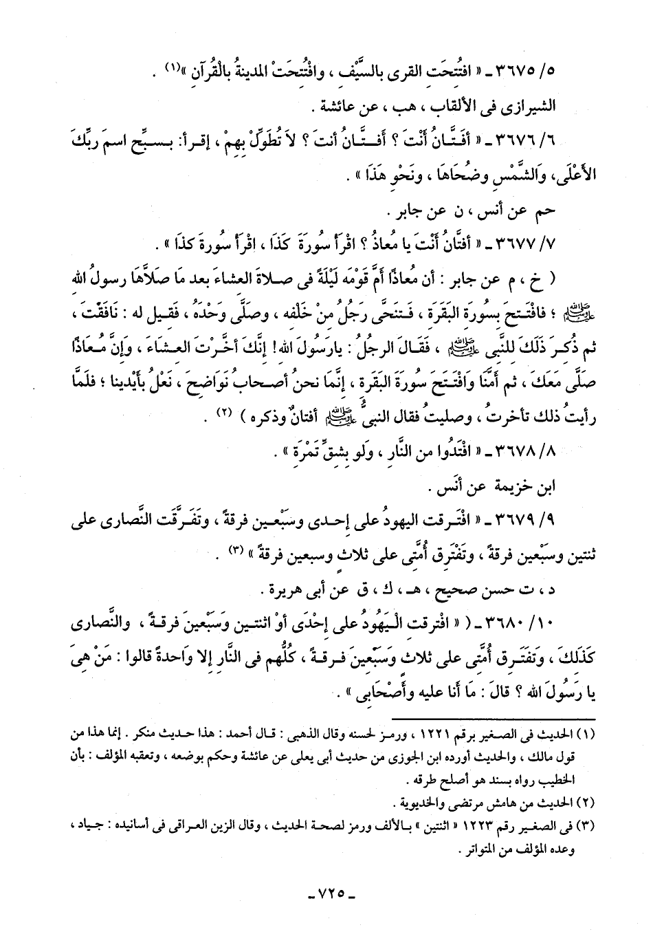 9/ 3679 - "افْتَرقت اليهودُ على إِحدى وسَبْعين فرقةً، وتَفَرَّقت النَّصارى على ثنتين وسَبْعين فرقةً، وتَفْتَرِق أُمَّتِي على ثلاثٍ وسبعين فرقةً" (¬3).