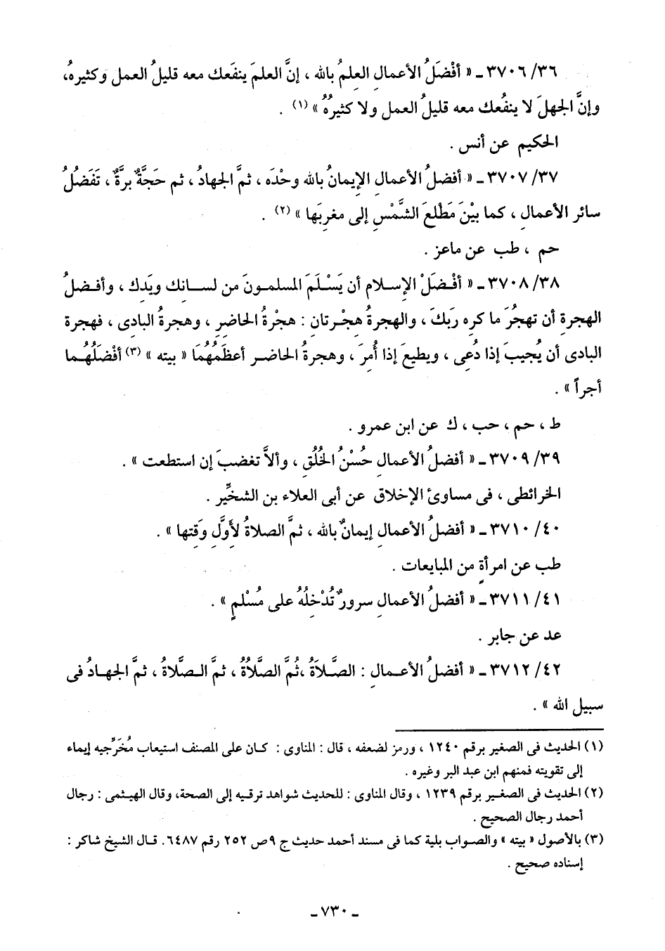 37/ 3707 - "أفضلُ الأعمالِ الإِيمانُ بالله وحْدَه، ثمَّ الجهادُ، ثم حَجَّة برَّة، تَفَضُلُ سائر الأعمالِ، كما بينَ مَطلعَ الشَّمْسِ إلى مغرِبَها" (¬2).