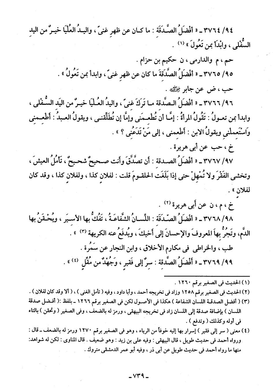 94/ 3764 - "أفْضَلُ الصَّدَقَة: ما كان عن ظهرِ غنىً، واليدُ العُليَا خير من اليدِ السُّفْلى، وابْدَأ بمن تَعُولَ" (¬1).