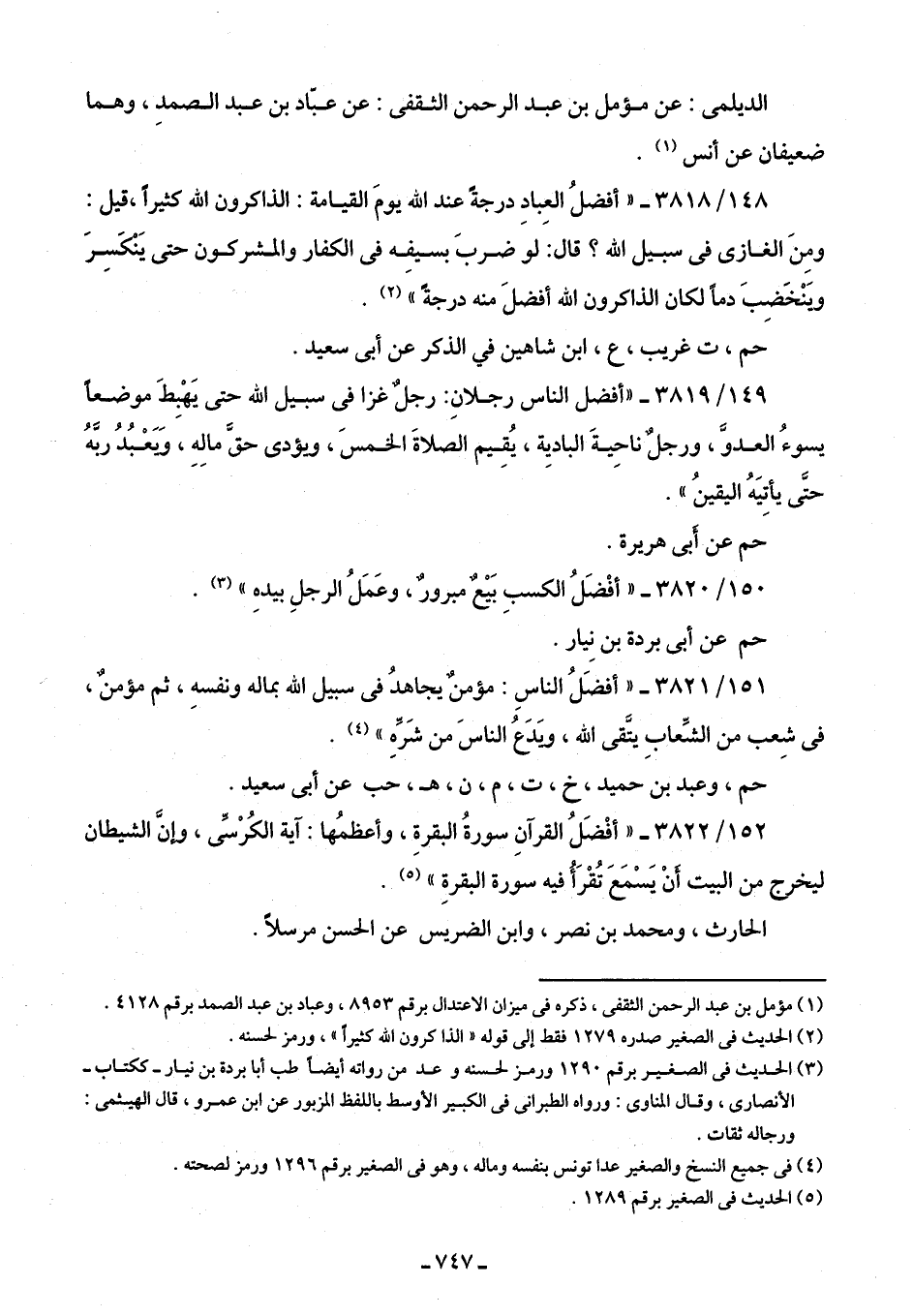 149/ 3819 - "أفضل الناس رجلانِ: رجلٌ غزا في سبيل الله حتى يَهْبِطَ موضعًا يسوءُ العدوَّ، ورجلٌ ناحِيةَ الباديِة، يُقِيم الصلاةَ الخمسَ، ويؤدى حقَّ مالِهِ، وَيَعْبُدُ ربَّهُ حتَّى يأتِيَهُ اليقينُ".