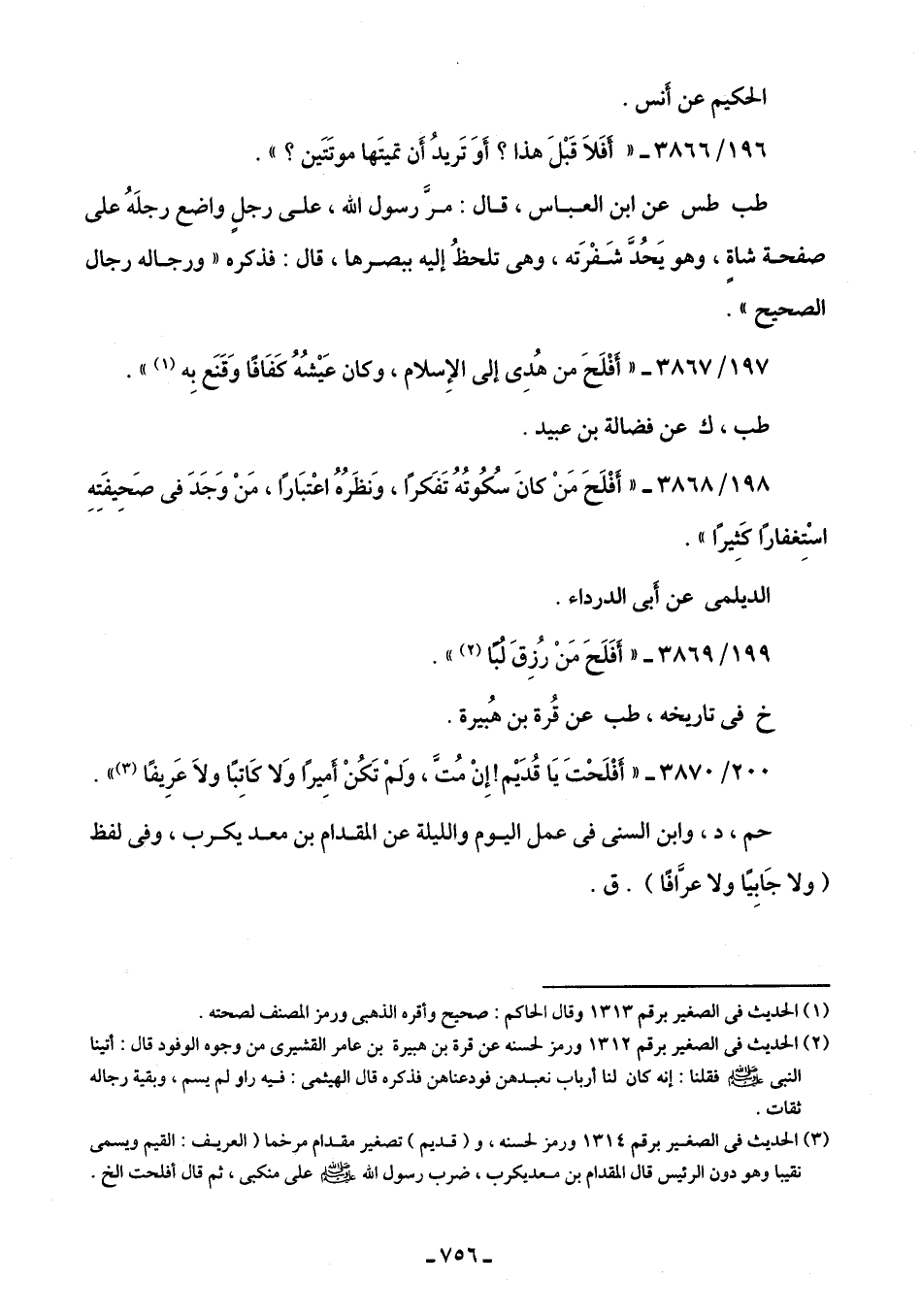 197/ 3867 - "أفْلَحَ مِن هُدِى إلى الإِسلام، وكَان عَيشُهُ كَفَافًا وَقَنَع بِه (¬1) ".