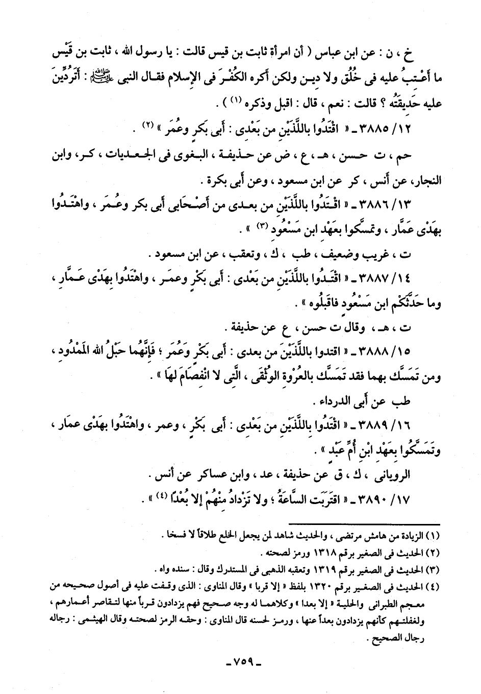 13/ 3886 - "اقْتَدُوا باللَّذَينِ مِن بعدى مِن أَصحابي أبي بكر وعُمَر، واهْتَدُوا بهَدْى عَمَّار، وتمسَّكوا بعَهْدِ ابن مَسْعُودِ (¬3) ".