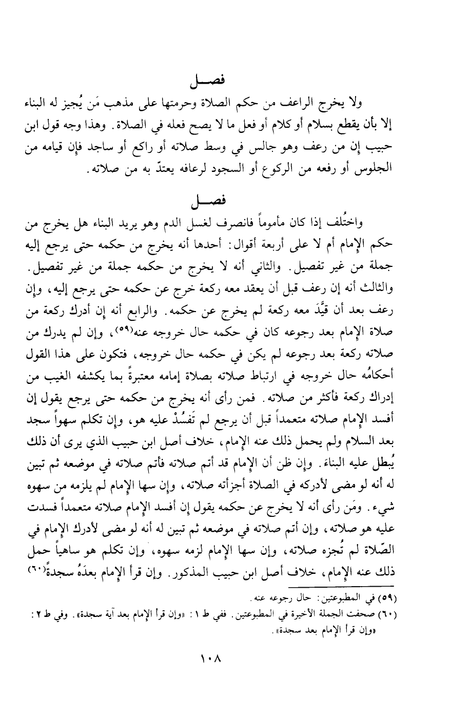 ولا يخرج الراعف من حكم الصلاة وحرمتها على مذهب من يجيز له البناء إلا بأن يقطع بسلام أو كلام أو فعل ما لا يصح فعله في الصلاة. وهذا وجه قول ابن حبيب إن من رعف وهو جالس في وسط صلاته أو راكع أو ساجد فإن قيامه من الجلوس أو رفعه من الركوع أو السجود لرعافه يعتد به من صلاته.