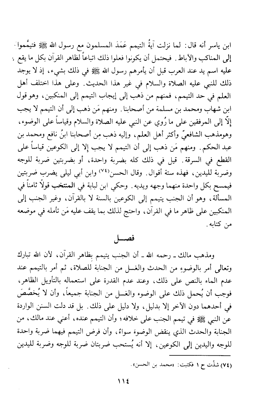 ومذهب مالك - رَحِمَهُ اللَّهُ - أن الجنب يتيمم بظاهر القرآن؛ لأن الله تبارك وتعالى أمر بالوضوء من الحدث والغسل من الجنابة للصلاة، ثم أمر بالتيمم عند عدم الماء بالنص على ذلك، وعند عدم القدرة على استعماله بالتأويل الظاهر، فوجب أن يحمل ذلك على الوضوء والغسل من الجنابة جميعا، وأن لا يخصص في أحدهما دون الآخر إلا بدليل، ولا دليل على ذلك. بل قد دلت السنن الواردة عن النبي - صَلَّى اللَّهُ عَلَيْهِ وَسَلَّمَ - في تيمم الجنب على خلافه؛ وأن التيمم عنده، أعني عند مالك، من الجنابة والحدث الذي ينقض الوضوء سواء، وأن فرض التيمم فيهما ضربة واحدة للوجه واليدين إلى الكوعين، إلا أنه يستحب ضربتان ضربة للوجه وضربة لليدين