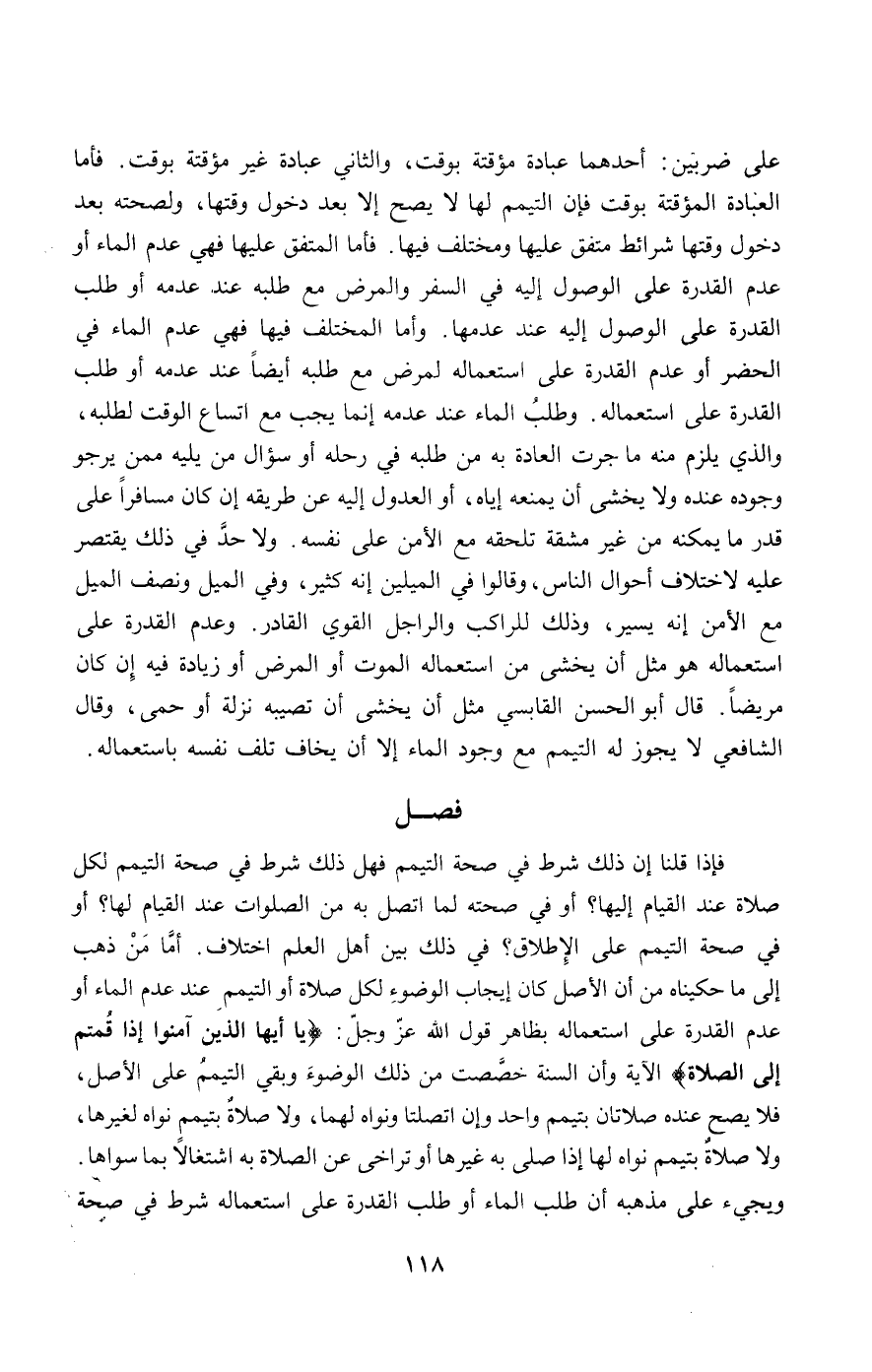 على ضربين: أحدهما عبادة مؤقتة بوقت، والثاني عبادة غير مؤقتة بوقت. فأما العبادة المؤقتة بوقت فإن التيمم لها لا يصح إلا بعد دخول وقتها، ولصحته بعد دخول وقتها شرائط متفق عليها ومختلف فيها. فأما المتفق عليها فهي عدم الماء أو عدم القدرة على الوصول إليه في السفر والمرض مع طلبه عند عدمه أو طلب القدرة على الوصول إليه عند عدمها. وأما المختلف فيها فهي عدم الماء في الحضر أو عدم القدرة على استعماله لمرض مع طلبه أيضا عند عدمه أو طلب القدرة على استعماله. وطلب الماء عند عدمه إنما يجب مع اتساع الوقت لطلبه، والذي يلزم منه ما جرت العادة به من طلبه في رحله أو سؤال من يليه ممن يرجو وجوده عنده ولا يخشى أن يمنعه إياه، أو العدول إليه عن طريقه إن كان مسافرا على قدر ما يمكنه من غير مشقة تلحقه مع الأمن على نفسه. ولا حد في ذلك يقتصر عليه لاختلاف أحوال الناس، وقالوا في الميلين إنه كثير، وفي الميل ونصف الميل مع الأمن إنه يسير، وذلك للراكب والراجل القوي القادر. وعدم القدرة على استعماله هو مثل أن يخشى من استعماله الموت أو المرض أو زيادة فيه إن كان مريضا. قال أبو الحسن القابسى مثل أن يخشى أن تصيبه نزلة أو حمى، وقال الشافعي لا يجوز له التيمم مع وجود الماء إلا أن يخاف تلف نفسه باستعماله.