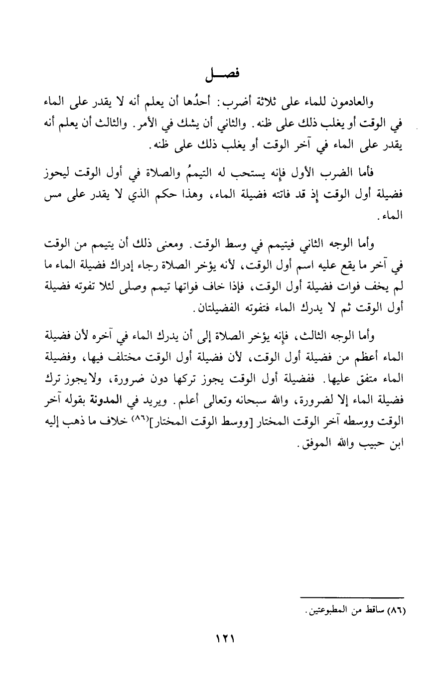 وأما الوجه الثالث، فإنه يؤخر الصلاة إلى أن يدرك الماء في آخره لأن فضيلة الماء أعظم من فضيلة أول الوقت؛ لأن فضيلة أول الوقت مختلف فيها، وفضيلة الماء متفق عليها. ففضيلة أول الوقت يجوز تركها دون ضرورة، ولا يجوز ترك فضيلة الماء إلا لضرورة، والله سبحانه وتعالى أعلم. ويريد في المدونة بقوله آخر الوقت ووسطه آخر الوقت المختار [ووسط الوقت المختار] خلاف ما ذهب إليه ابن حبيب والله الموفق.
