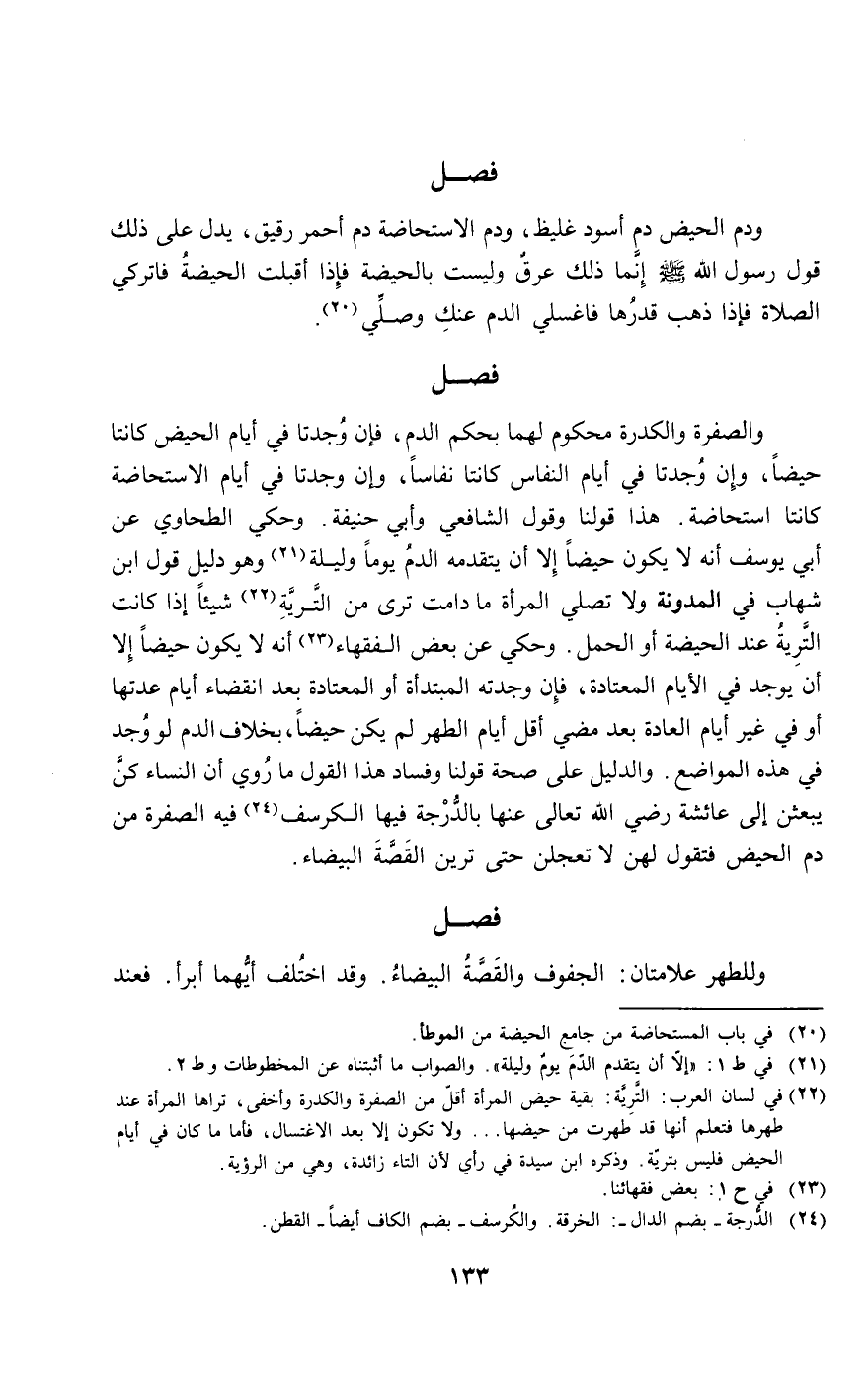 والصفرة والكدرة محكوم لهما بحكم الدم، فإن وجدتا في أيام الحيض كانتا حيضا، وإن وجدتا في أيام النفاس كانتا نفاسا، وإن وجدتا في أيام الاستحاضة كانتا استحاضة. هذا قولنا وقول الشافعي وأبي حنيفة، وحكى الطحاوي عن أبي يوسف أنه لا يكون حيضا إلا أن يتقدمه الدم يوما وليلة، وهو دليل قول ابن شهاب في المدونة، ولا تصلي المرأة ما دامت ترى من الترية شيئا إذا كانت الترية عند الحيضة أو الحمل، وحكي عن بعض الفقهاء أنه لا يكون حيضا إلا أن يوجد في الأيام المعتادة، فإن وجدته المبتدأة أو المعتادة بعد انقضاء أيام عدتها أو في غير أيام العادة بعد مضي أقل أيام الطهر لم يكن حيضا، بخلاف الدم لو وجد في هذه المواضع، والدليل على صحة قولنا وفساد هذا القول: ما روي أن النساء كن يبعثن إلى عائشة - رَضِيَ اللَّهُ تَعَالَى عَنْهَا - بالدرجة فيها الكرسف فيه الصفرة من دم الحيض فتقول لهن لا تعجلن حتى ترين القصة البيضاء.