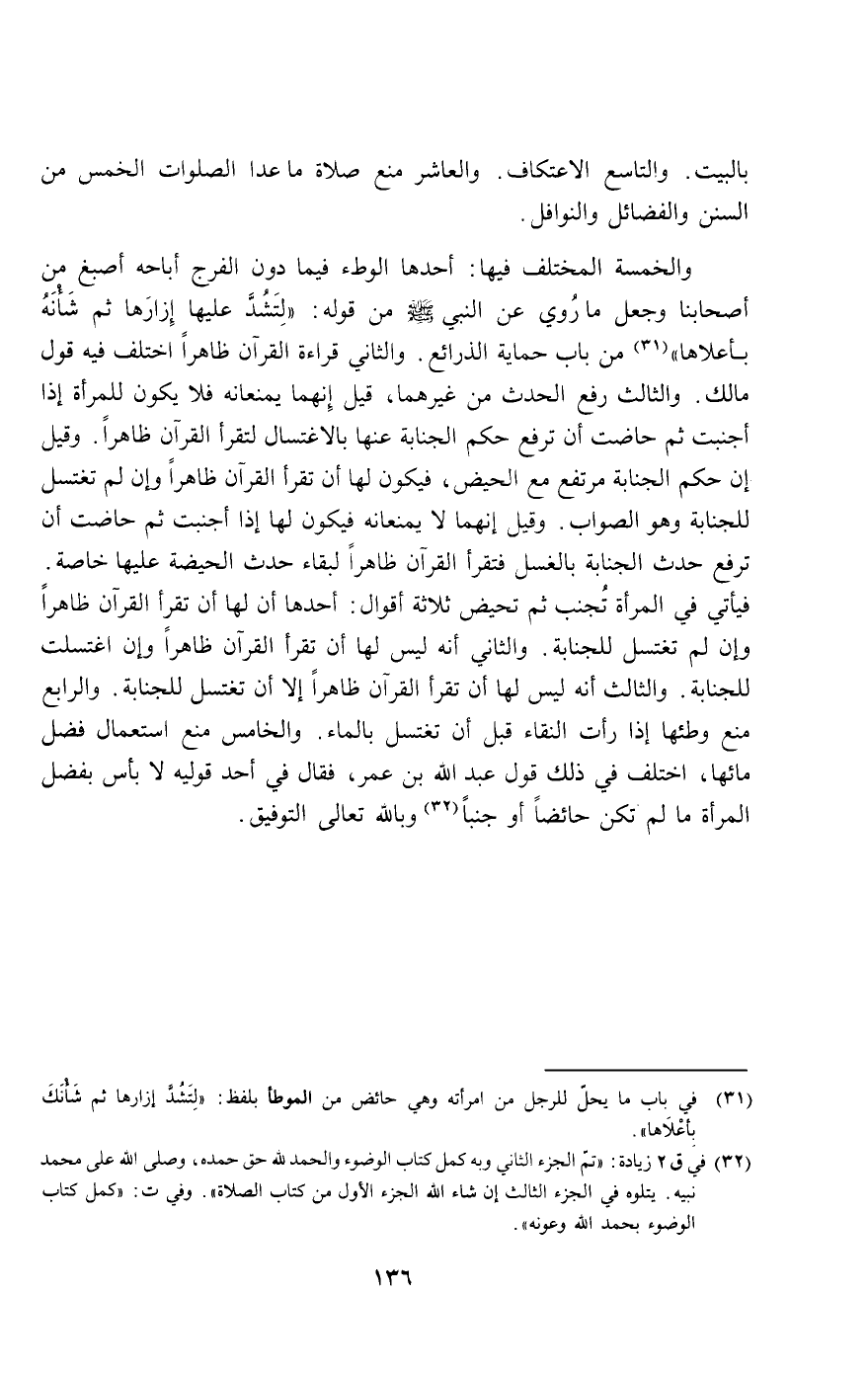 والخمسة المختلف فيها: أحدها: الوطء فيما دون الفرج أباحه أصبغ من أصحابنا وجعل ما روي عن النبي - صَلَّى اللَّهُ عَلَيْهِ وَسَلَّمَ - من قوله: «لتشد عليها إزارها ثم شأنه بأعلاها» من باب حماية الذرائع. والثاني: قراءة القرآن ظاهرا اختلف فيه قول مالك. والثالث: رفع الحدث من غيرهما، قيل إنهما يمنعانه فلا يكون للمرأة إذا أجنبت ثم حاضت أن ترفع حكم الجنابة عنها بالاغتسال لتقرأ القرآن ظاهرا. وقيل إن حكم الجنابة مرتفع مع الحيض، فيكون لها أن تقرأ القرآن ظاهرا وإن لم تغتسل للجنابة وهو الصواب. وقيل إنهما لا يمنعانه فيكون لها إذا أجنبت ثم حاضت أن ترفع حدث الجنابة بالغسل فتقرأ القرآن ظاهرا لبقاء حدث الحيضة عليها خاصة. فيأتي في المرأة تجنب ثم تحيض ثلاثة أقوال: أحدها: أن لها أن تقرأ القرآن ظاهرا وإن لم تغتسل للجنابة. والثاني: أنه ليس لها أن تقرأ القرآن ظاهرا وإن اغتسلت للجنابة. والثالث: أنه ليس لها أن تقرأ القرآن ظاهرا إلا أن تغتسل للجنابة. والرابع: منع وطئها إذا رأت النقاء قبل أن تغتسل بالماء. والخامس: منع استعمال فضل مائها، اختلف في ذلك قول عبد الله بن عمر، فقال في أحد قوليه: لا بأس بفضل المرأة ما لم تكن حائضا أو جنبا وبالله تعالى التوفيق.