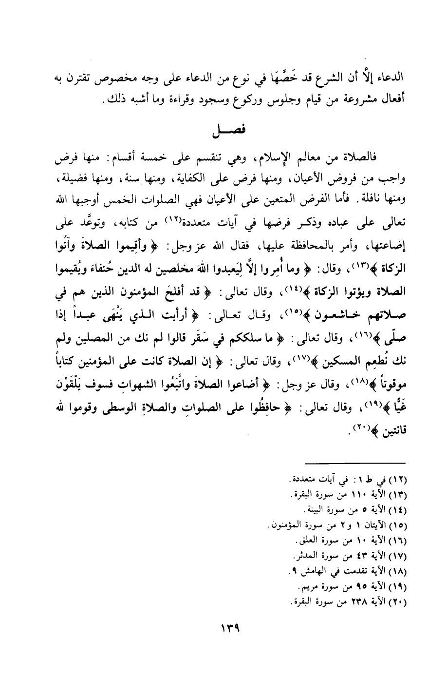فالصلاة من معالم الإسلام، وهي تنقسم على خمسة أقسام: منها فرض واجب من فروض الأعيان، ومنها فرض على الكفاية، ومنها سنة، ومنها فضيلة، ومنها نافلة. فأما الفرض المتعين على الأعيان فهي الصلوات الخمس أوجبها الله تعالى على عباده وذكر فرضها في آيات متعددة من كتابه، وتوعد على إضاعتها، وأمر بالمحافظة عليها، فقال الله عز وجل: {وَأَقِيمُوا الصَّلاةَ وَآتُوا الزَّكَاةَ} [البقرة: 43]، وقال: {وَمَا أُمِرُوا إِلا لِيَعْبُدُوا اللَّهَ مُخْلِصِينَ لَهُ الدِّينَ حُنَفَاءَ وَيُقِيمُوا الصَّلاةَ وَيُؤْتُوا الزَّكَاةَ} [البينة: 5]، وقال تعالى: {قَدْ أَفْلَحَ الْمُؤْمِنُونَ} [المؤمنون: 1] {الَّذِينَ هُمْ فِي صَلاتِهِمْ خَاشِعُونَ} [المؤمنون: 2]، وقال تعالى: {أَرَأَيْتَ الَّذِي يَنْهَى} [العلق: 9] {عَبْدًا إِذَا صَلَّى} [العلق: 10]، وقال تعالى: {مَا سَلَكَكُمْ فِي سَقَرَ} [المدثر: 42] {قَالُوا لَمْ نَكُ مِنَ الْمُصَلِّينَ} [المدثر: 43] {وَلَمْ نَكُ نُطْعِمُ الْمِسْكِينَ} [المدثر: 44]، وقال تعالى: {إِنَّ الصَّلاةَ كَانَتْ عَلَى الْمُؤْمِنِينَ كِتَابًا مَوْقُوتًا} [النساء: 103]، وقال عز وجل: {أَضَاعُوا الصَّلاةَ وَاتَّبَعُوا الشَّهَوَاتِ فَسَوْفَ يَلْقَوْنَ غَيًّا} [مريم: 59]، وقال تعالى: {حَافِظُوا عَلَى الصَّلَوَاتِ وَالصَّلاةِ الْوُسْطَى وَقُومُوا لِلَّهِ قَانِتِينَ} [البقرة: 238].