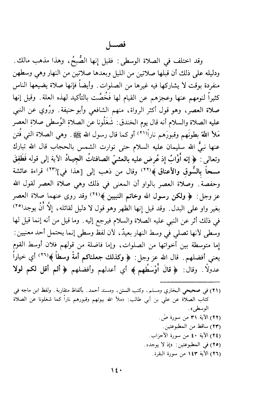 وقد اختلف في الصلاة الوسطى: فقيل: إنها الصبح، وهذا مذهب مالك. ودليله على ذلك أن قبلها صلاتين من الليل وبعدها صلاتين من النهار وهي وسطهن منفردة بوقت لا يشاركها فيه غيرها من الصلوات. وأيضا فإنها صلاة يضيعها الناس كثيرا لنومهم عنها وعجزهم عن القيام لها فخصت بالتأكيد لهذه العلة. وقيل: إنها صلاة العصر، وهو قول أكثر الرواة، منهم الشافعي وأبو حنيفة. وروي عن النبي - عَلَيْهِ الصَّلَاةُ وَالسَّلَامُ - أنه قال يوم الخندق: «شغلونا عن الصلاة الوسطى صلاة العصر ملأ الله بطونهم وقبورهم نارا» أو كما قال رسول الله - صَلَّى اللَّهُ عَلَيْهِ وَسَلَّمَ -. وهي الصلاة التي فتن عنها نبي الله سليمان - عَلَيْهِ السَّلَامُ - حتى توارت الشمس بالحجاب. قال الله تبارك وتعالى: {إِنَّهُ أَوَّابٌ} [ص: 17] {إِذْ عُرِضَ عَلَيْهِ بِالْعَشِيِّ الصَّافِنَاتُ الْجِيَادُ} [ص: 31] الآية إلى قوله {فَطَفِقَ مَسْحًا بِالسُّوقِ وَالأَعْنَاقِ} [ص: 33] وقال من ذهب إلى هذا في قراءة عائشة وحفصة وصلاة العصر بالواو: إن المعنى في ذلك وهي صلاة العصر؛ لقول الله عز وجل: {وَلَكِنْ رَسُولَ اللَّهِ وَخَاتَمَ النَّبِيِّينَ} [الأحزاب: 40]، وقد روى عنهما صلاة العصر بغير واو على البدل. وقد قيل: إنها الظهر، وهو قول لا دليل لقائله، إلا أن يوجد في ذلك أثر عن النبي - عَلَيْهِ الصَّلَاةُ وَالسَّلَامُ - فيرجع إليه. وما قيل من أنه إنما قيل لها وسطى؛ لأنها تصلى في وسط النهار بعيد؛ لأن لفظ وسطى إنما يحتمل أحد معنيين: إما متوسطة بين أخواتها من الصلوات، وإما فاضلة من قولهم فلان أوسط القوم يعني أفضلهم. قال الله عز وجل: {وَكَذَلِكَ جَعَلْنَاكُمْ أُمَّةً وَسَطًا} [البقرة: 143] أي: خيارا عدولا. وقال: {قَالَ أَوْسَطُهُمْ} [القلم: 28] أي: أعدلهم وأفضلهم {أَلَمْ أَقُلْ لَكُمْ لَوْلا تُسَبِّحُونَ} [القلم: 28]