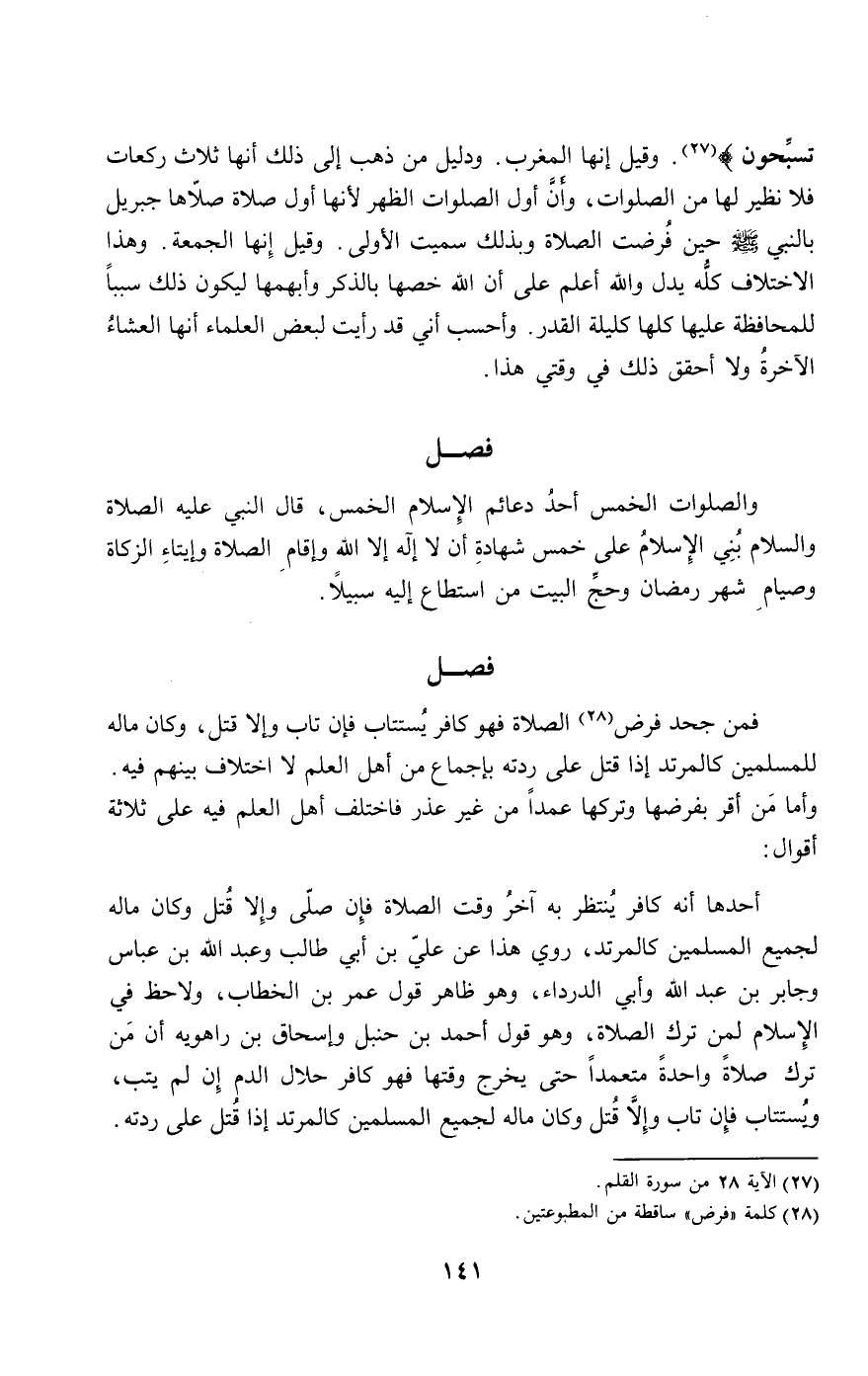 فمن جحد فرض الصلاة فهو كافر يستتاب، فإن تاب وإلا قتل، وكان ماله للمسلمين كالمرتد إذا قتل على ردته بإجماع من أهل العلم لا اختلاف بينهم فيه. وأما من أقر بفرضها وتركها عمدا من غير عذر، فاختلف أهل العلم فيه على ثلاثة أقوال: