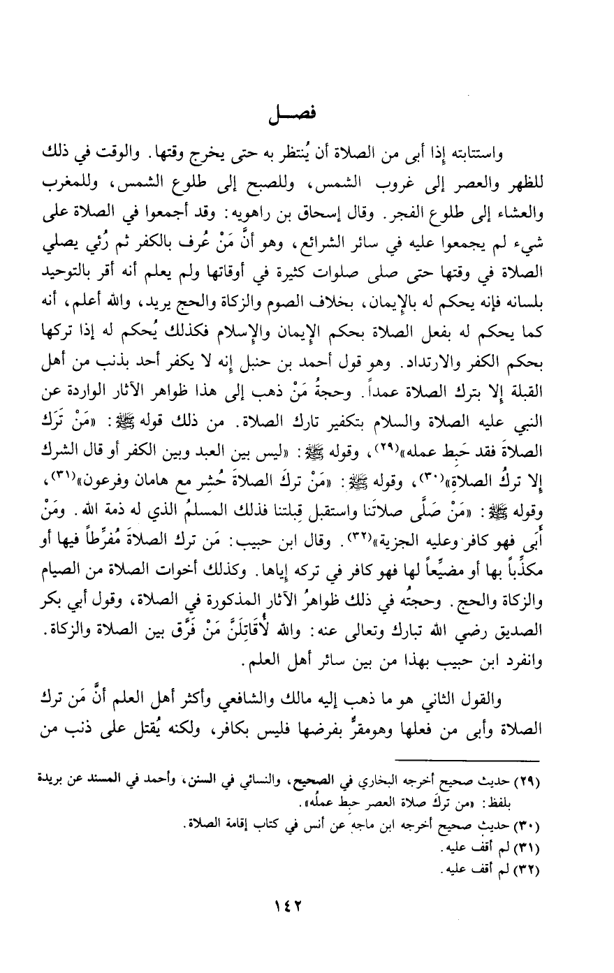 واستتابته إذا أبى من الصلاة أن ينتظر به حتى يخرج وقتها. والوقت في ذلك للظهر والعصر إلى غروب الشمس، وللصبح إلى طلوع الشمس، وللمغرب والعشاء إلى طلوع الفجر. وقال إسحاق بن راهويه: وقد أجمعوا في الصلاة على شيء لم يجمعوا عليه في سائر الشرائع، وهو أن من عرف بالكفر ثم رئي يصلي الصلاة في وقتها حتى صلى صلوات كثيرة في أوقاتها ولم يعلم أنه أقر بالتوحيد بلسانه فإنه يحكم له بالإيمان، بخلاف الصوم والزكاة والحج يريد، والله أعلم، أنه كما يحكم له بفعل الصلاة بحكم الإيمان والإسلام، فكذلك يحكم له إذا تركها بحكم الكفر والارتداد. وهو قول أحمد بن حنبل: إنه لا يكفر أحد بذنب من أهل القبلة إلا بترك الصلاة عمدا. وحجة من ذهب إلى هذا: ظواهر الآثار الواردة عن النبي - عَلَيْهِ الصَّلَاةُ وَالسَّلَامُ - بتكفير تارك الصلاة. من ذلك قوله - صَلَّى اللَّهُ عَلَيْهِ وَسَلَّمَ -: «من ترك الصلاة فقد حبط عمله»، وقوله - صَلَّى اللَّهُ عَلَيْهِ وَسَلَّمَ -: «ليس بين العبد وبين الكفر أو قال الشرك إلا ترك الصلاة»، وقوله - صَلَّى اللَّهُ عَلَيْهِ وَسَلَّمَ -: «من ترك الصلاة حشر مع هامان وفرعون»، وقوله - صَلَّى اللَّهُ عَلَيْهِ وَسَلَّمَ -: «من صلى صلاتنا واستقبل قبلتنا فذلك المسلم الذي له ذمة الله. ومن أبى فهو كافر وعليه الجزية». وقال ابن حبيب: من ترك الصلاة مفرطا فيها أو مكذبا بها أو مضيعا لها فهو كافر في تركه إياها، وكذلك أخوات الصلاة من الصيام والزكاة والحج. وحجته في ذلك: ظواهر الآثار المذكورة في الصلاة، وقول أبي بكر الصديق - رَضِيَ اللَّهُ تَبَارَكَ وَتَعَالَى عَنْهُ -: والله لأقاتلن من فرق بين الصلاة والزكاة. وانفرد ابن حبيب بهذا من بين سائر أهل العلم.