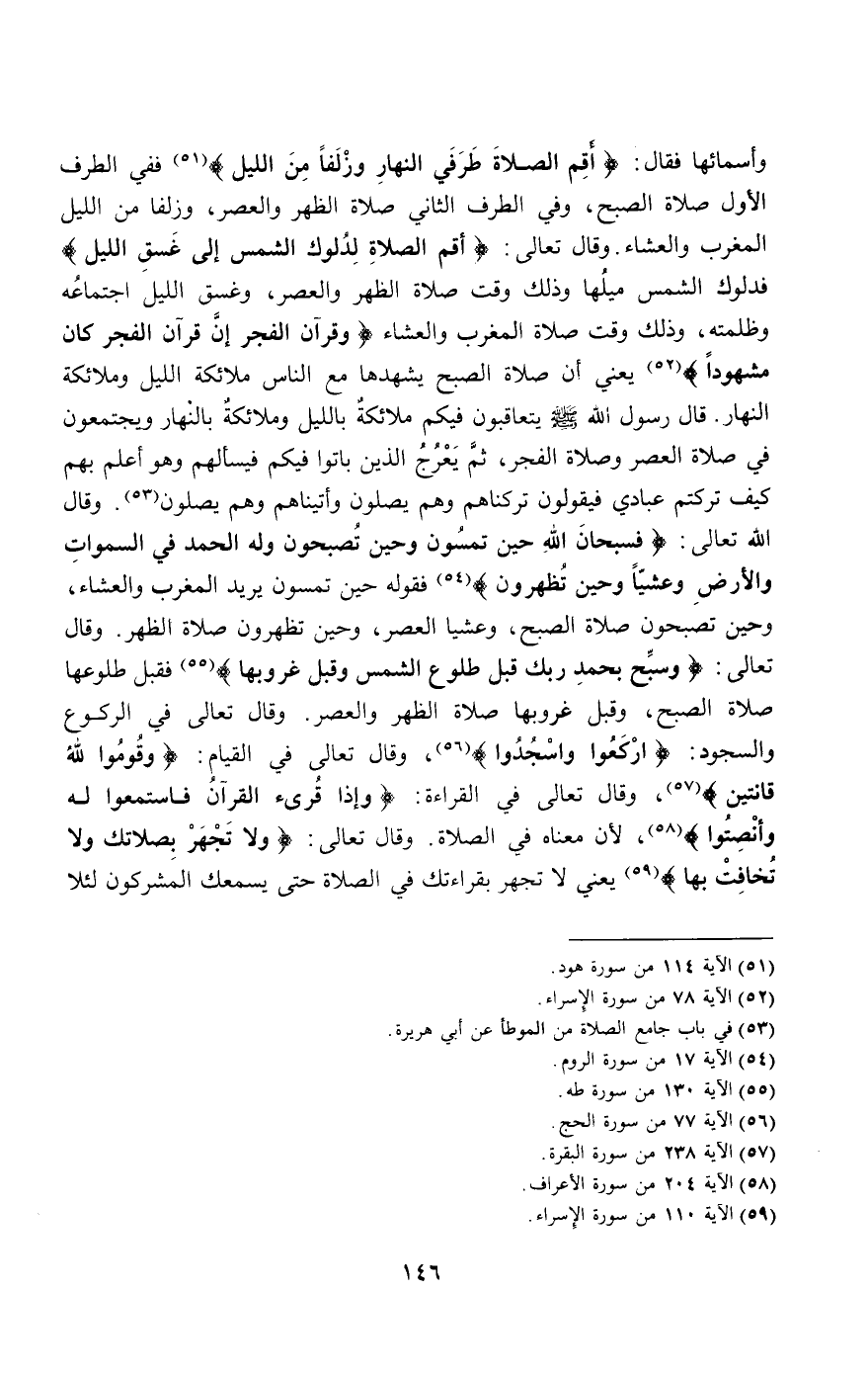 وأسمائها فقال: {وَأَقِمِ الصَّلاةَ طَرَفَيِ النَّهَارِ وَزُلَفًا مِنَ اللَّيْلِ} [هود: 114]، ففي الطرف الأول صلاة الصبح، وفي الطرف الثاني صلاة الظهر والعصر، وزلفا من الليل المغرب والعشاء، وقال تعالى: {أَقِمِ الصَّلاةَ لِدُلُوكِ الشَّمْسِ إِلَى غَسَقِ اللَّيْلِ} [الإسراء: 78]، فدلوك الشمس ميلها وذلك وقت صلاة الظهر والعصر، وغسق الليل اجتماعه وظلمته، وذلك وقت صلاة المغرب والعشاء، {وَقُرْآنَ الْفَجْرِ إِنَّ قُرْآنَ الْفَجْرِ كَانَ مَشْهُودًا} [الإسراء: 78] يعني أن صلاة الصبح يشهدها مع الناس ملائكة الليل وملائكة النهار. قال رسول الله - صَلَّى اللَّهُ عَلَيْهِ وَسَلَّمَ -: «يتعاقبون فيكم ملائكة بالليل وملائكة بالنهار ويجتمعون في صلاة العصر وصلاة الفجر، ثم يعرج الذين باتوا فيكم فيسألهم وهو أعلم بهم، كيف تركتم عبادي؟ فيقولون: تركناهم وهم يصلون وأتيناهم وهم يصلون» وقال الله تعالى: {فَسُبْحَانَ اللَّهِ حِينَ تُمْسُونَ وَحِينَ تُصْبِحُونَ} [الروم: 17] {وَلَهُ الْحَمْدُ فِي السَّمَاوَاتِ وَالأَرْضِ وَعَشِيًّا وَحِينَ تُظْهِرُونَ} [الروم: 18]، فقوله حين تمسون يريد المغرب والعشاء، وحين تصبحون صلاة الصبح، وعشيا العصر، وحين تظهرون صلاة الظهر، وقال تعالى: {وَسَبِّحْ بِحَمْدِ رَبِّكَ قَبْلَ طُلُوعِ الشَّمْسِ وَقَبْلَ غُرُوبِهَا} [طه: 130] فقبل طلوعها صلاة الصبح، وقبل غروبها صلاة الظهر والعصر، وقال تعالى في الركوع والسجود: {ارْكَعُوا وَاسْجُدُوا} [الحج: 77]، وقال تعالى في القيام: {وَقُومُوا لِلَّهِ قَانِتِينَ} [البقرة: 238]، وقال تعالى في القراءة: {وَإِذَا قُرِئَ الْقُرْآنُ فَاسْتَمِعُوا لَهُ وَأَنْصِتُوا} [الأعراف: 204]؛ لأن معناه في الصلاة، وقال تعالى: {وَلا تَجْهَرْ بِصَلاتِكَ وَلا تُخَافِتْ بِهَا} [الإسراء: 110] يعني لا تجهر بقراءتك في الصلاة حتى يسمعك المشركون لئلا