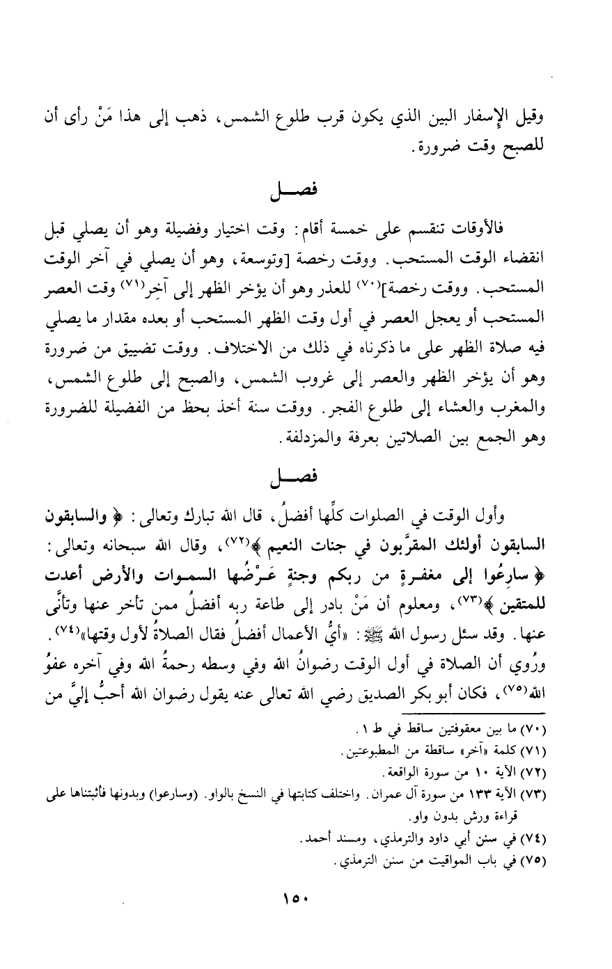 وأول الوقت في الصلوات كلها أفضل، قال الله تبارك وتعالى: {وَالسَّابِقُونَ السَّابِقُونَ} [الواقعة: 10] {أُولَئِكَ الْمُقَرَّبُونَ} [الواقعة: 11] {فِي جَنَّاتِ النَّعِيمِ} [الواقعة: 12]، وقال الله سبحانه وتعالى: {وَسَارِعُوا إِلَى مَغْفِرَةٍ مِنْ رَبِّكُمْ وَجَنَّةٍ عَرْضُهَا السَّمَاوَاتُ وَالأَرْضُ أُعِدَّتْ لِلْمُتَّقِينَ} [آل عمران: 133]، ومعلوم أن من بادر إلى طاعة ربه أفضل ممن تأخر عنها وتأنى عنها، وقد سئل رسول الله - صَلَّى اللَّهُ عَلَيْهِ وَسَلَّمَ -: أي الأعمال أفضل، فقال: «الصلاة لأول وقتها». وروي أن الصلاة في أول الوقت رضوان الله وفي وسطه رحمة الله وفي آخره عفو الله، فكان أبو بكر الصديق - رَضِيَ اللَّهُ تَعَالَى عَنْهُ - يقول رضوان الله أحب إلي من