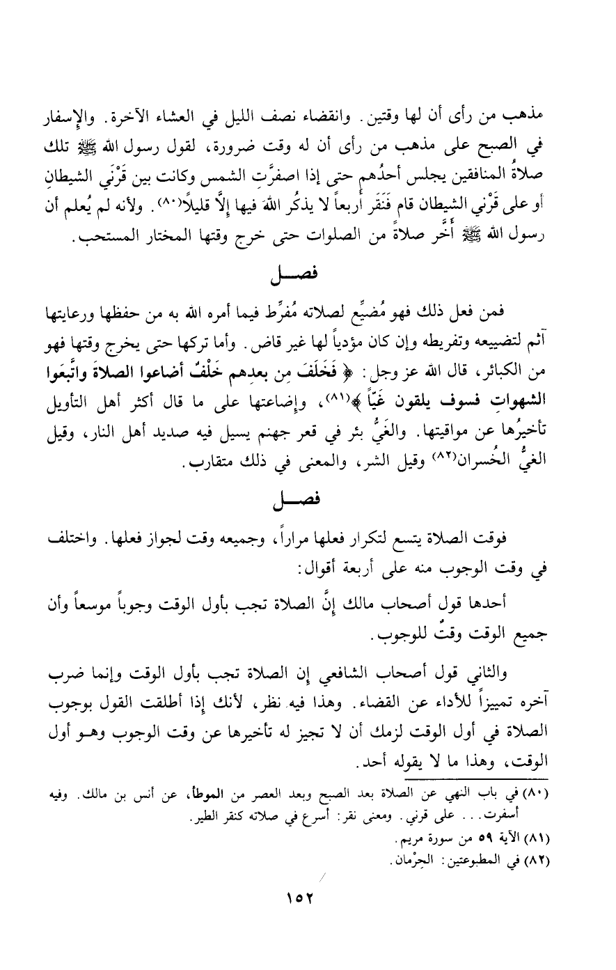 فمن فعل ذلك فهو مضيع لصلاته مفرط فيما أمره الله به من حفظها ورعايتها آثم لتضييعه وتفريطه وإن كان مؤديا لها غير قاض. وأما تركها حتى يخرج وقتها فهو من الكبائر، قال الله عز وجل: {فَخَلَفَ مِنْ بَعْدِهِمْ خَلْفٌ أَضَاعُوا الصَّلاةَ وَاتَّبَعُوا الشَّهَوَاتِ فَسَوْفَ يَلْقَوْنَ غَيًّا} [مريم: 59]، وإضاعتها على ما قال أكثر أهل التأويل تأخيرها عن مواقيتها. والغي بئر في قعر جهنم يسيل فيه صديد أهل النار، وقيل: الغي الخسران وقيل: الشمر، والمعنى في ذلك متقارب.