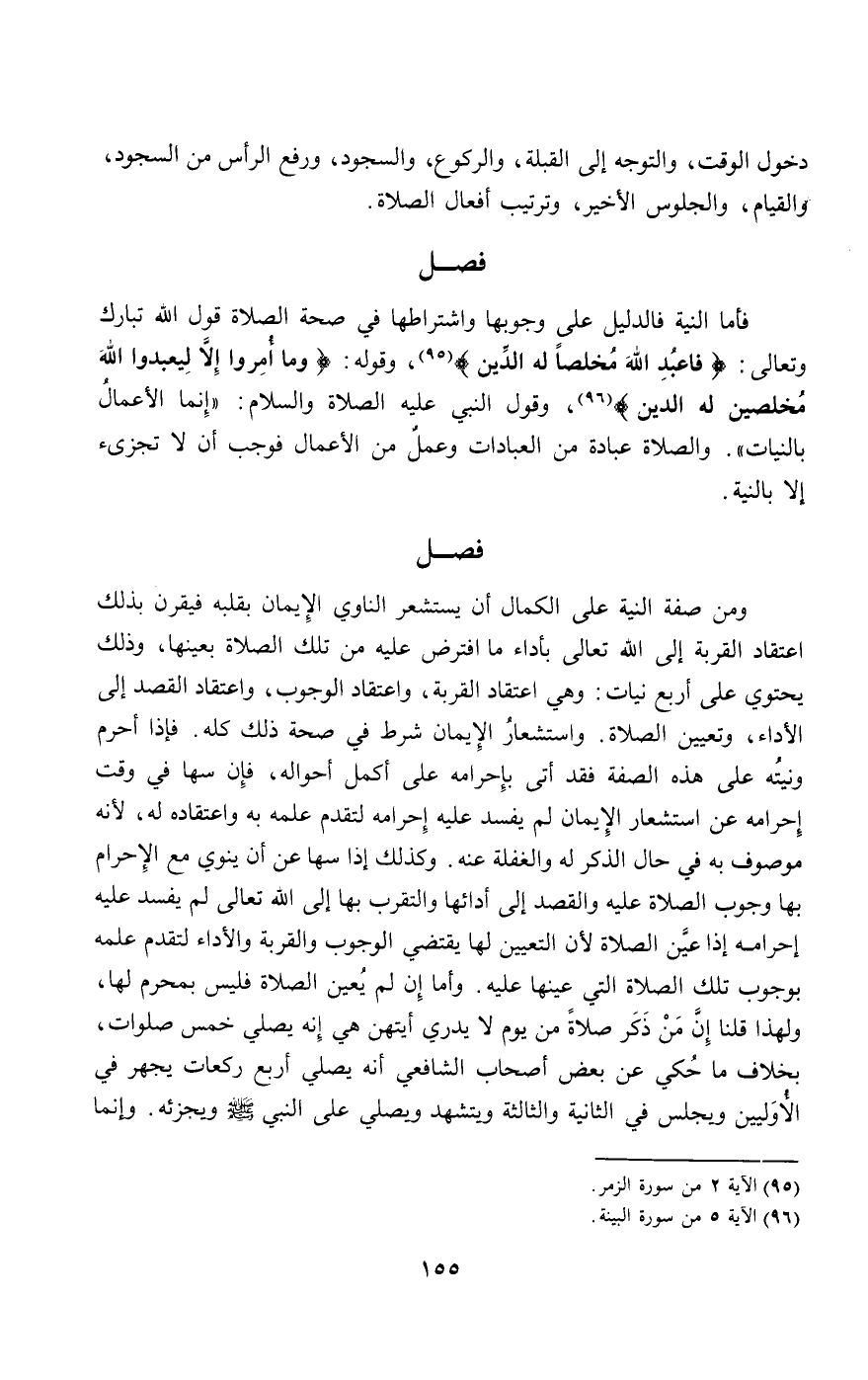 فأما النية فالدليل على وجوبها واشتراطها في صحة الصلاة قول الله تبارك وتعالى: {فَاعْبُدِ اللَّهَ مُخْلِصًا لَهُ الدِّينَ} [الزمر: 2]، وقوله: {وَمَا أُمِرُوا إِلا لِيَعْبُدُوا اللَّهَ مُخْلِصِينَ لَهُ الدِّينَ} [البينة: 5]، وقول النبي - عَلَيْهِ الصَّلَاةُ وَالسَّلَامُ -: «إنما الأعمال بالنيات». والصلاة عبادة من العبادات وعمل من الأعمال فوجب أن لا تجزئ إلا بالنية.