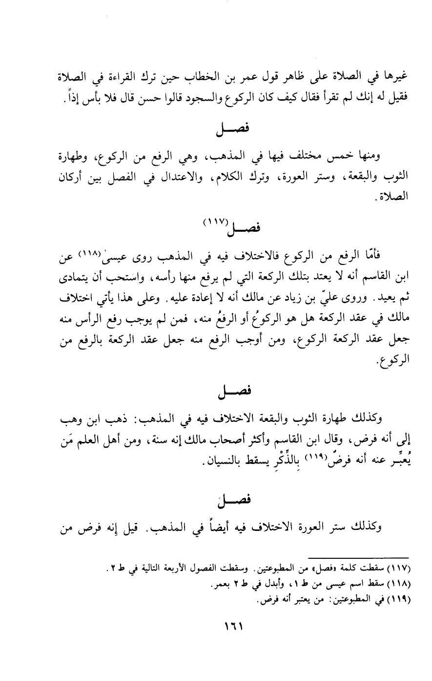 ومنها خمس مختلف فيها في المذهب، وهي: الرفع من الركوع، وطهارة الثوب والبقعة، وستر العورة، وترك الكلام، والاعتدال في الفصل بين أركان الصلاة.