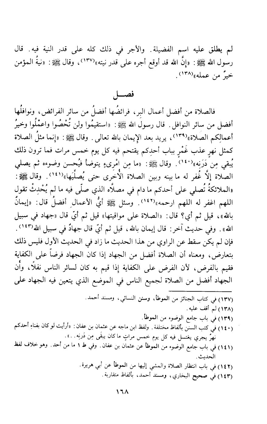 فالصلاة من أفضل أعمال البر، فرائضها أفضل من سائر الفرائض، ونوافلها أفضل من سائر النوافل. قال رسول الله - صَلَّى اللَّهُ عَلَيْهِ وَسَلَّمَ -: «استقيموا ولن تحصوا واعملوا وخير أعمالكم الصلاة»، يريد بعد الإيمان بالله تعالى، وقال - صَلَّى اللَّهُ عَلَيْهِ وَسَلَّمَ -: «إنما مثل الصلاة كمثل نهر عذب غمر بباب أحدكم يقتحم فيه كل يوم خمس مرات فما ترون ذلك يبقي من درنه»، وقال - صَلَّى اللَّهُ عَلَيْهِ وَسَلَّمَ -: «ما من امرئ يتوضأ فيحسن وضوءه ثم يصلي الصلاة إلا غفر له ما بينه وبين الصلاة الأخرى حتى يصليها»، وقال - صَلَّى اللَّهُ عَلَيْهِ وَسَلَّمَ -: «الملائكة تصلي على أحدكم ما دام في مصلاه الذي صلى فيه ما لم يحدث تقول اللهم اغفر له اللهم ارحمه». «وسئل - صَلَّى اللَّهُ عَلَيْهِ وَسَلَّمَ - أي الأعمال أفضل قال: " إيمان بالله "، قيل: ثم أي؟ قال: " الصلاة على مواقيتها " قيل: ثم أي قال: " جهاد في سبيل الله». وفي حديث آخر: قال: «إيمان بالله "، قيل: ثم أي قال: " جهاد في سبيل الله». وفي حديث آخر قال: «إيمان بالله " قيل: ثم أي، قال: " جهاد في سبيل الله» فإن لم يكن سقط عن الراوي من هذا الحديث ما زاد في الحديث الأول فليس ذلك بتعارض، ومعناه أن الصلاة أفضل من الجهاد إذا كان الجهاد فرضا على الكفاية فقيم بالفرض؛ لأن الفرض على الكفاية إذا قيم به كان لسائر الناس نفلا، وأن الجهاد أفضل من الصلاة لجميع الناس في الموضع الذي يتعين فيه الجهاد على