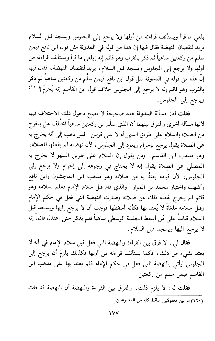 فقال لي: لا فرق بين القراءة والنهضة التي فعل قبل سلام الإمام في أنه لا يعتد بشيء من ذلك، فكما يستأنف قراءته من أولها فكذلك يلزم أن يرجع إلى الجلوس ليأتي بالنهضة التي فعل في حكم الإمام، فلم يعتد بها على مذهب ابن القاسم فيمن سلم من ركعتين.