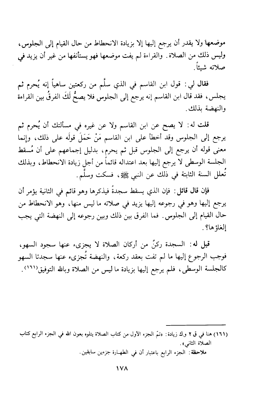 فقال لي: قول ابن القاسم في الذي سلم من ركعتين ساهيا إنه يحرم ثم يجلس، فقد قال ابن القاسم: إنه يرجع إلى الجلوس فلا يصح لك الفرق بين القراءة والنهضة بذلك.